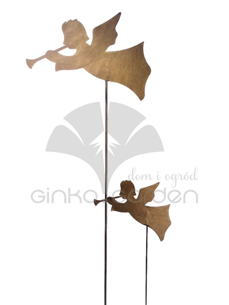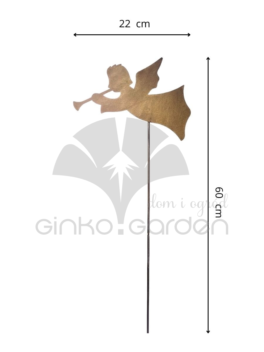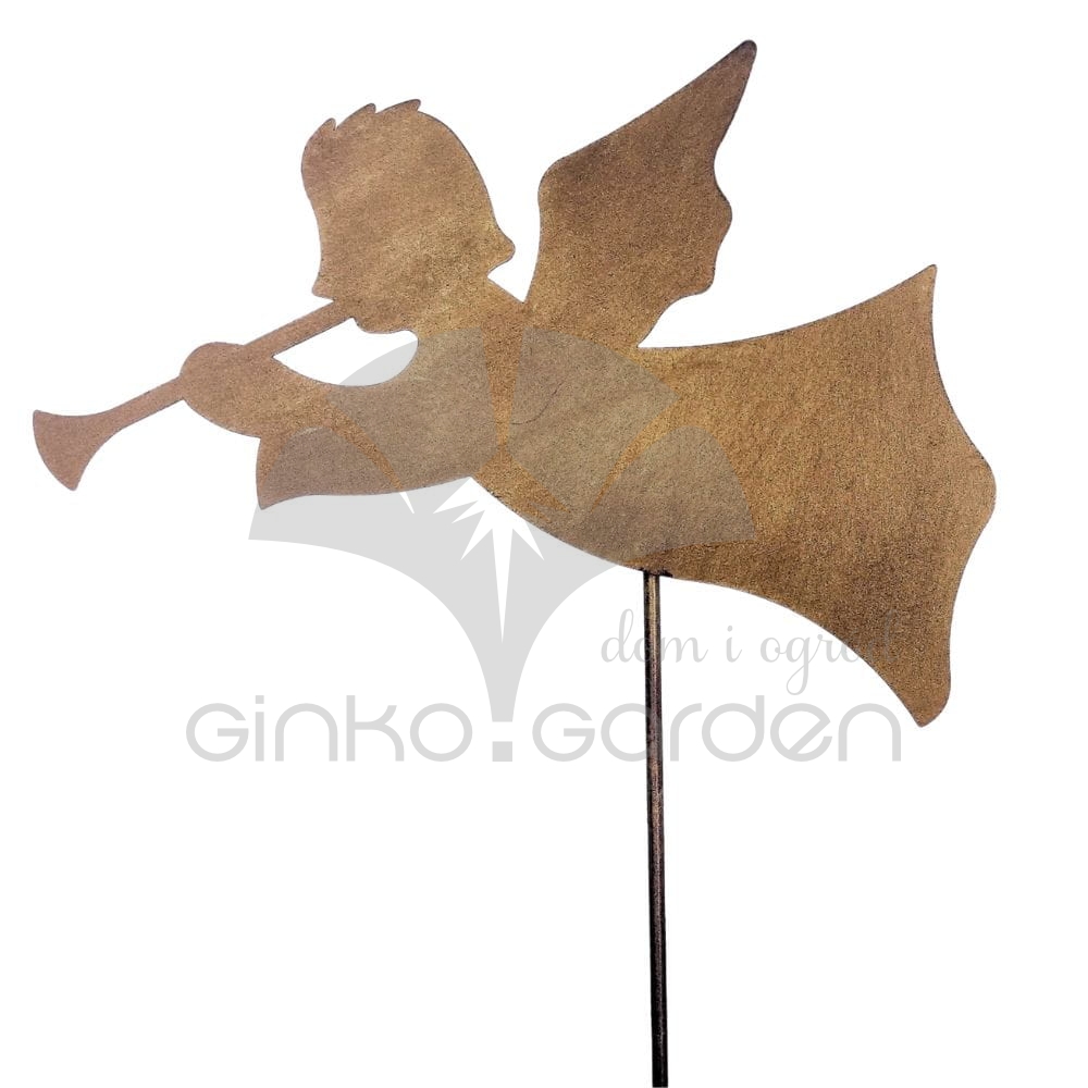 Metalowa dekoracja bożonarodzeniowa do ogrodu - aniołek na pręcie z trąbką. Ozdoba świąteczna wykonana w Polsce z wysokiej jakości stali, pomalowanej proszkowo na kolor złotej rdzy. Odporna na warunki atmosferyczne.