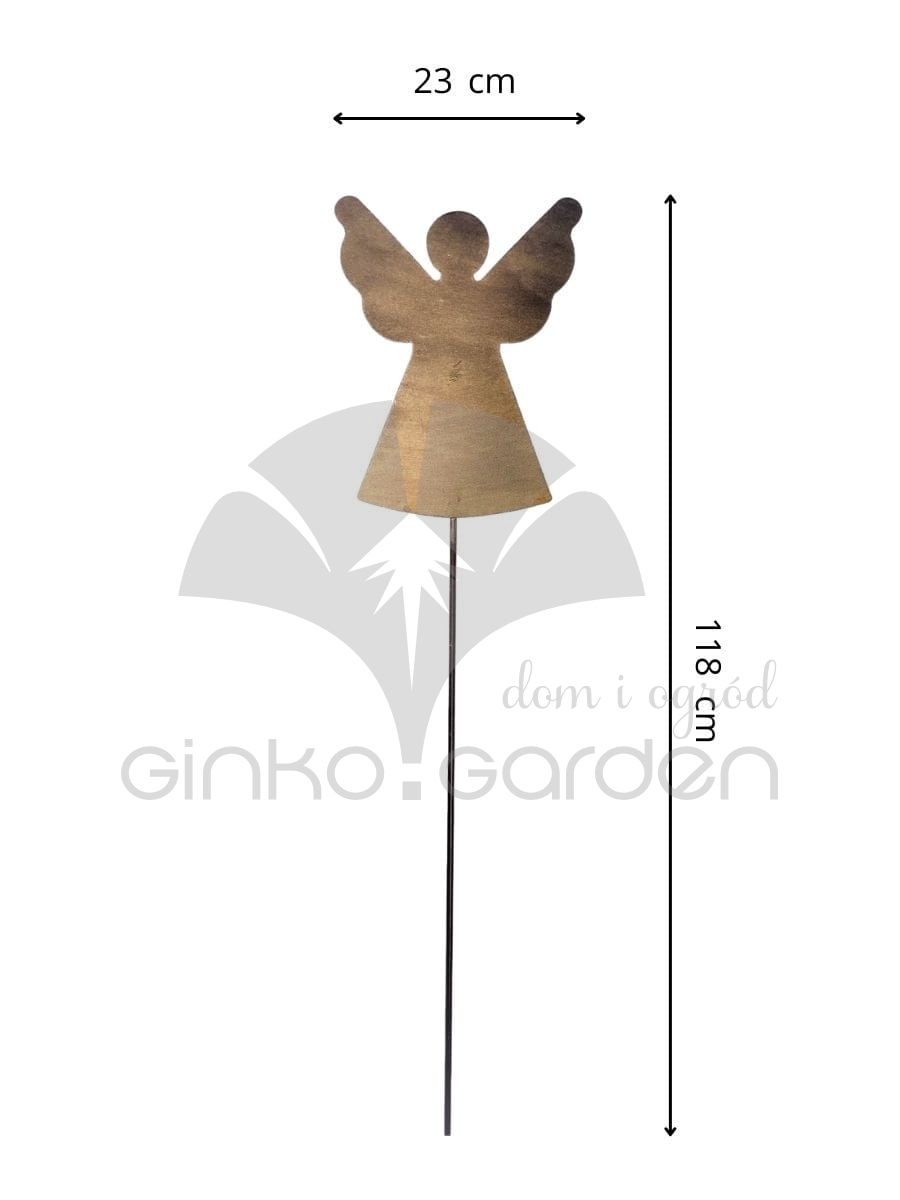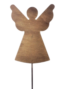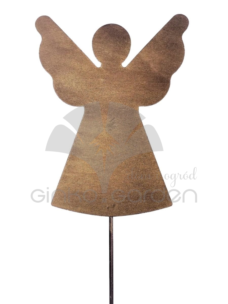 Metalowa dekoracja bożonarodzeniowa do ogrodu - aniołek na pręcie. Ozdoba świąteczna wykonana w Polsce z wysokiej jakości stali, pomalowanej proszkowo na kolor złotej rdzy. Odporna na warunki atmosferyczne.