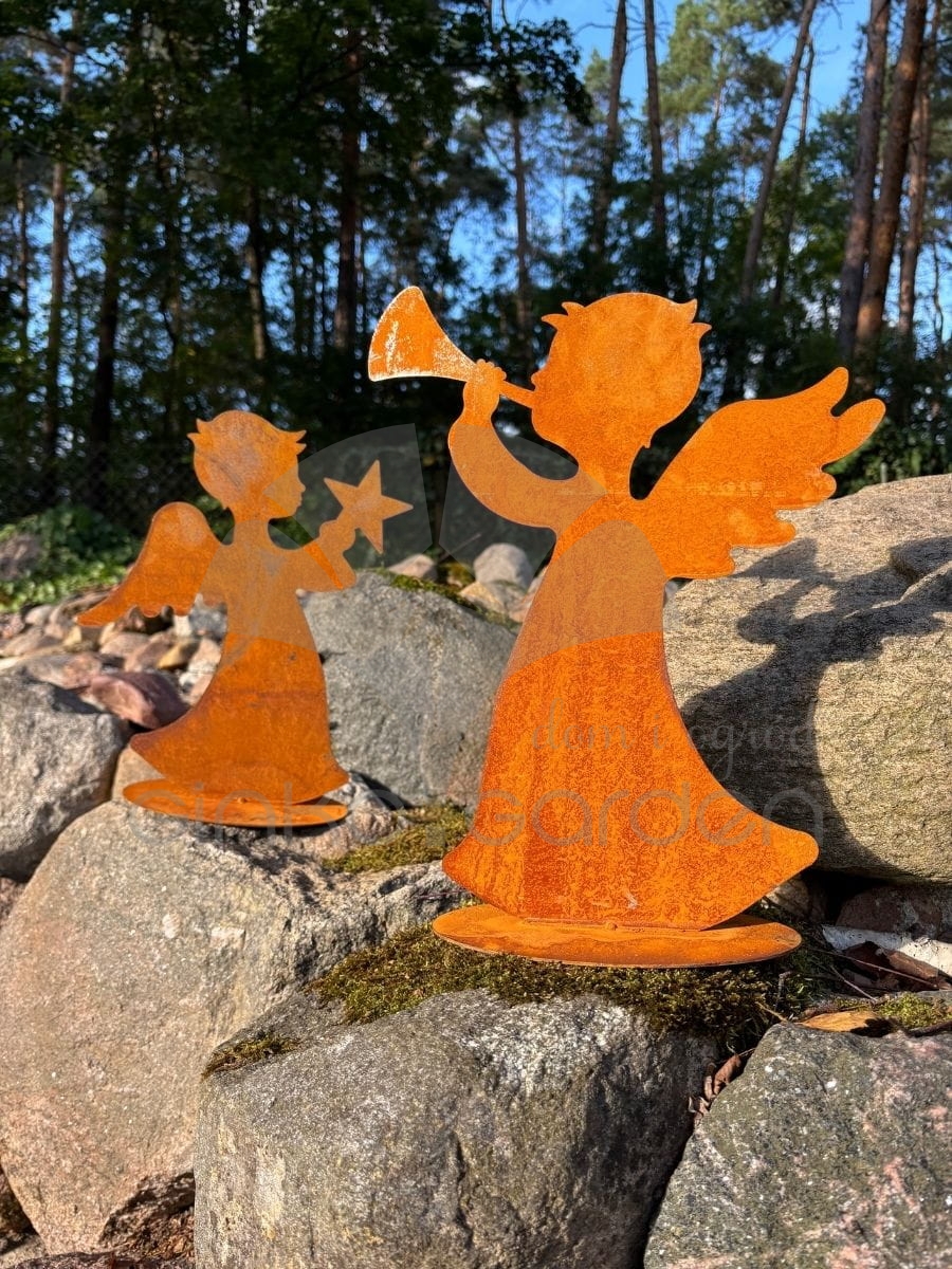 Metalowa figurka aniołka - artystyczna ozdoba bożonarodzeniowa na podstawce. Dekoracja wykonana w Polsce z wysokiej jakości stali, pokrytej naturalną warstwą rdzy - odporna na warunki atmosferyczne.