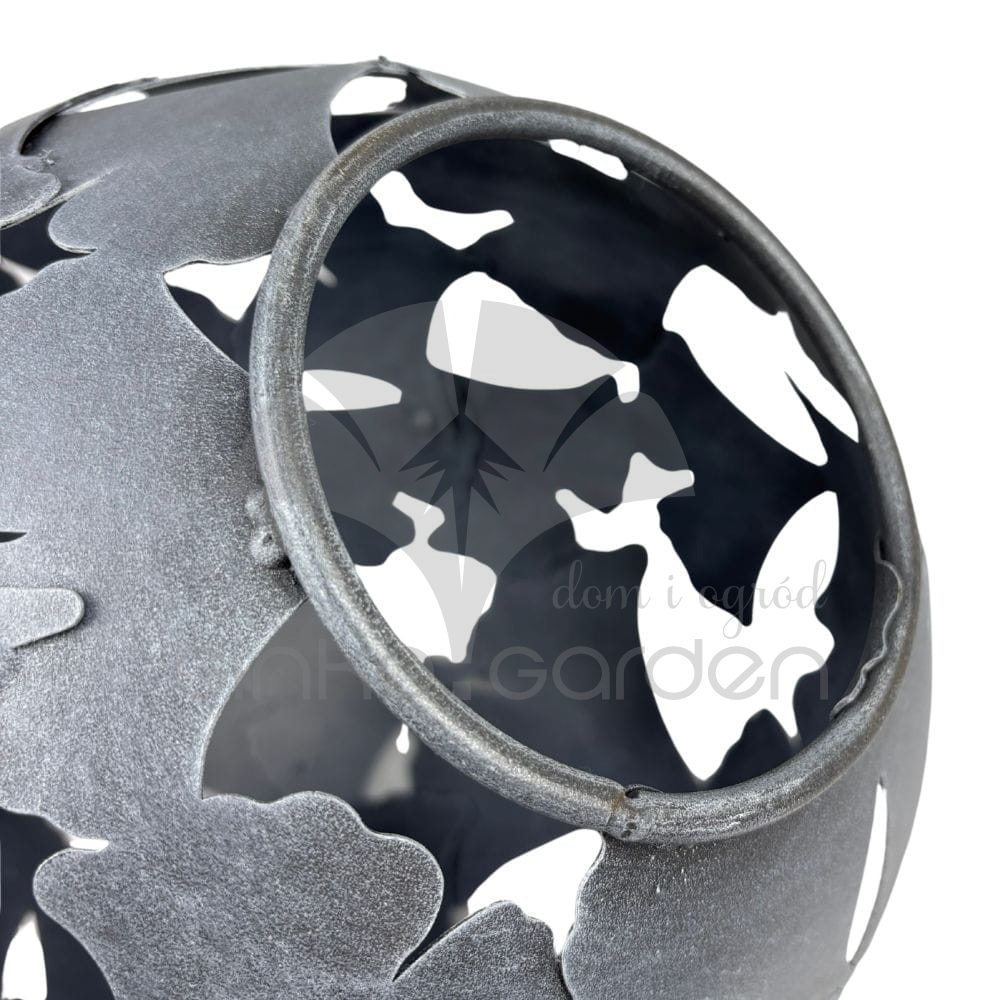 Metalowa ozdobna kula ogrodowa z motywem liści miłorzębu. Dekoracja do ogrodu wykonana w Polsce z wysokiej jakości stali, pomalowana proszkowo na kolor antracytowy - odporna na warunki atmosferyczne.