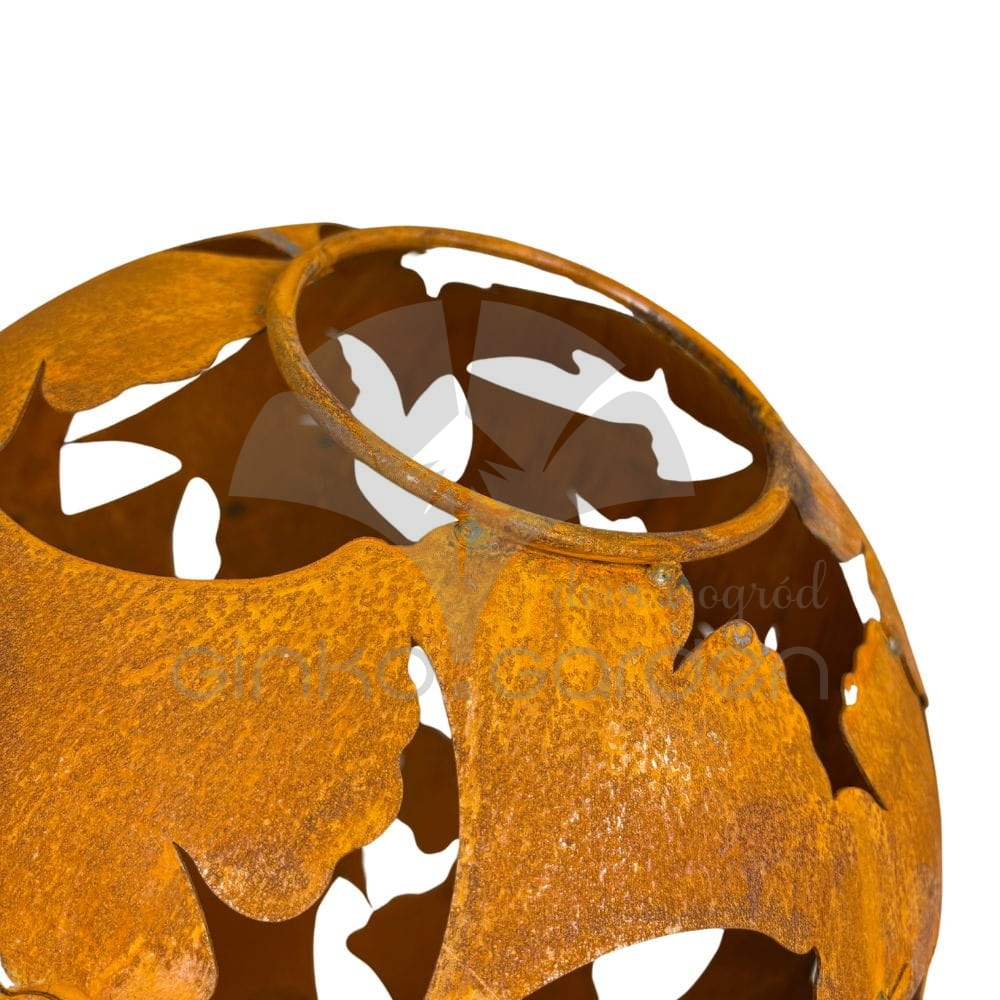 Metalowa ozdobna kula ogrodowa z motywem liści miłorzębu. Dekoracja do ogrodu wykonana w Polsce z wysokiej jakości stali, pokrytej naturalną warstwą rdzy - odporna na warunki atmosferyczne.