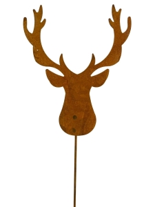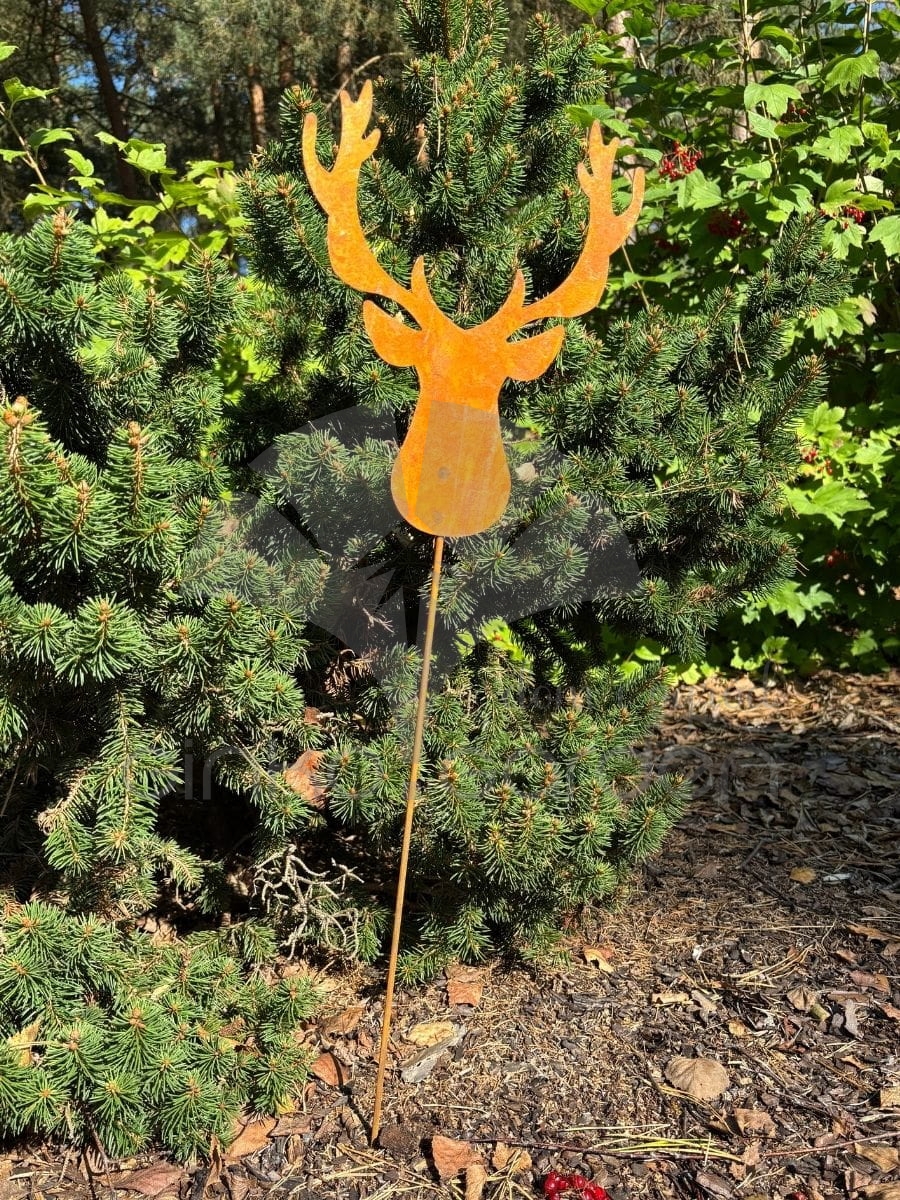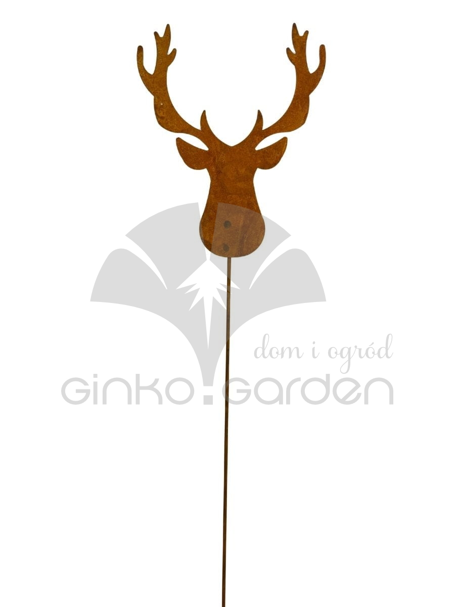 Dekoracja na Boże Narodzenie z metalu - głowa jelonka na pręcie. Ozdoba świąteczna wykonana w Polsce z wysokiej jakości stali, pokrytej naturalną warstwą rdzy. Odporna na warunki atmosferyczne.