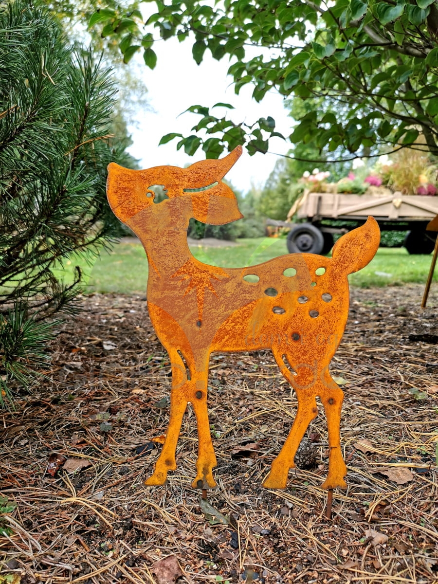 Ozdoba ogrodowa na prętach do wbicia, z metalu i pokryta rdzą, w kształcie jelonka Bambi.