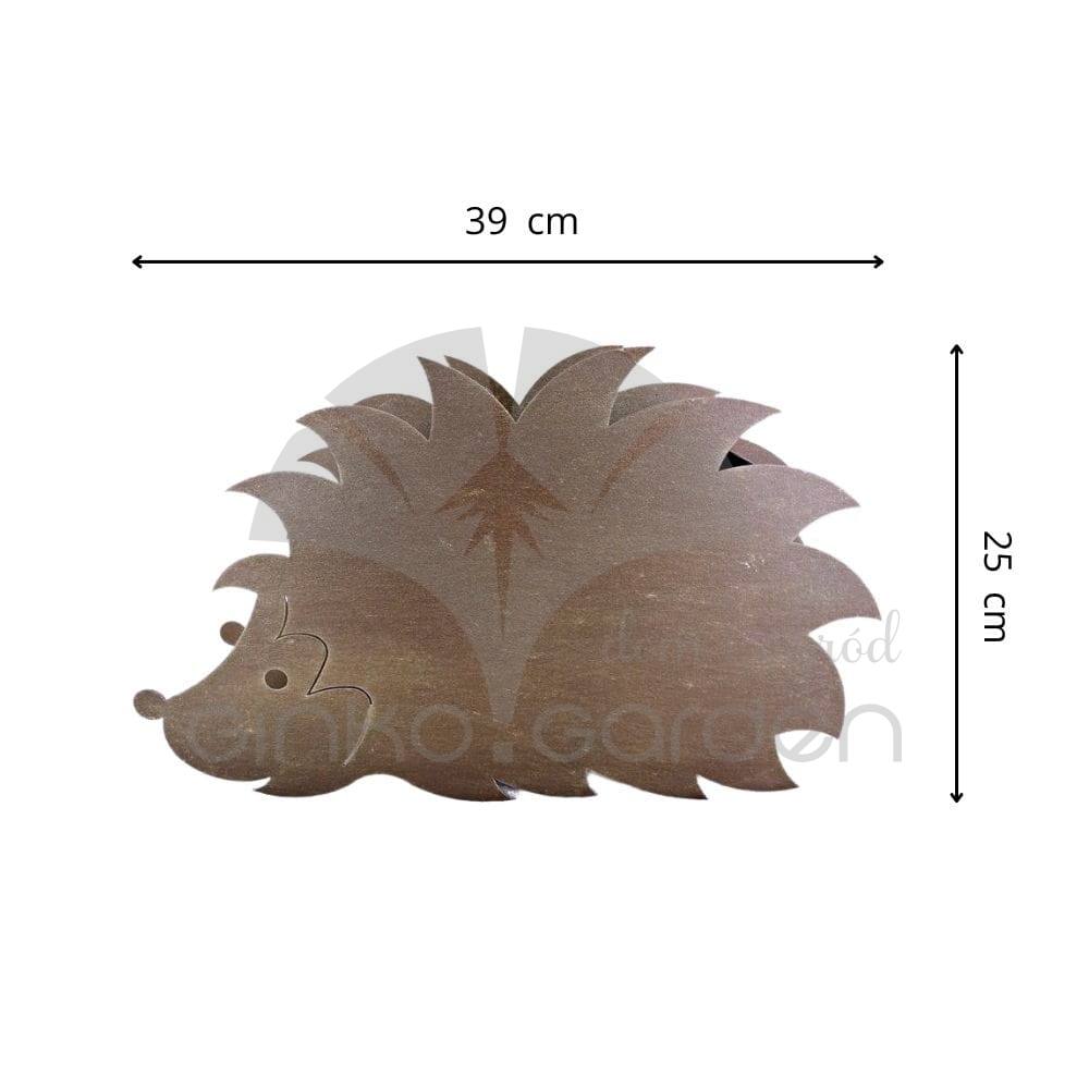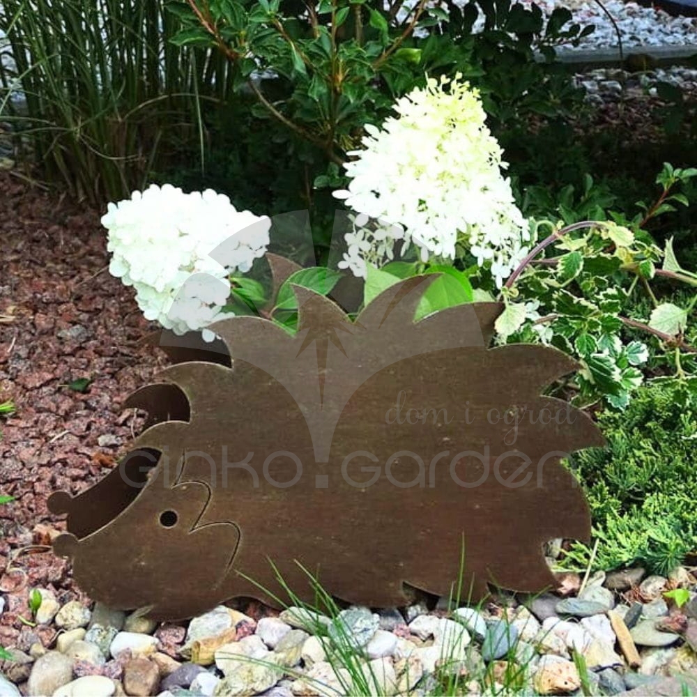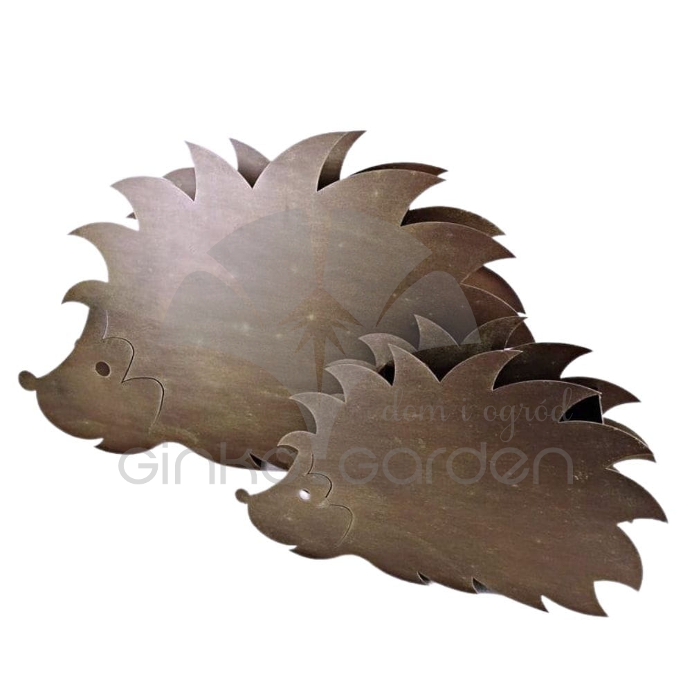 Doniczka ozdobna z metalu w kształcie jeża. Dekoracja do sadzenia roślin wykonana w Polsce, z wysokiej jakości stali pomalowanej proszkowo na kolor złotej rdzy. Odporna na warunki atmosferyczne.