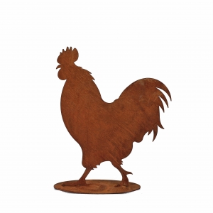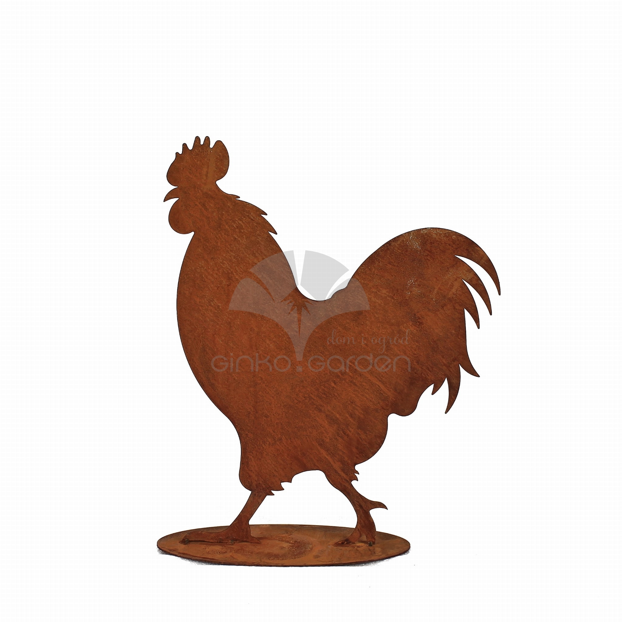 Metalowa figurka ogrodowa na podstawce w kształcie koguta. Ozdoba wyprodukowana w Polsce, wykonana z wysokiej jakości stali pokrytej naturalną warstwą rdzy. Odporna na warunki atmosferyczne.