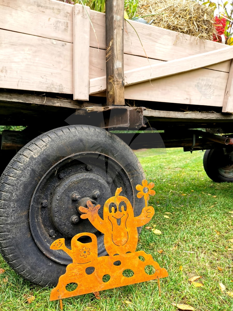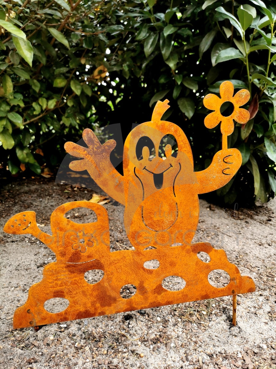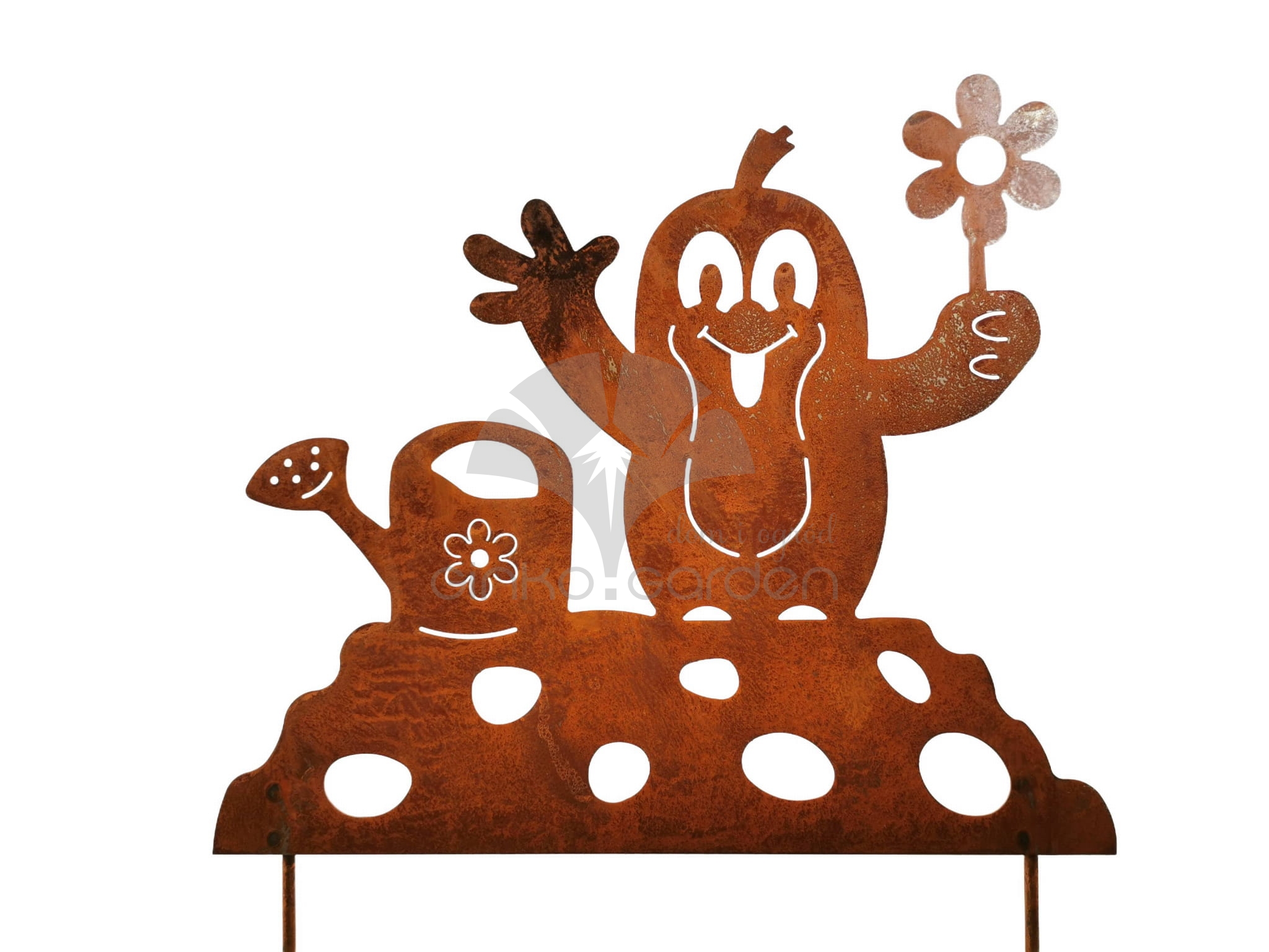 Figurka w kształcie kopca kreta z Krecikiem – ozdobna figurka ogrodowa w kolorze naturalnej rdzy.