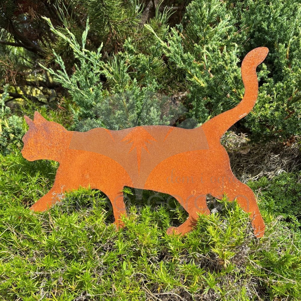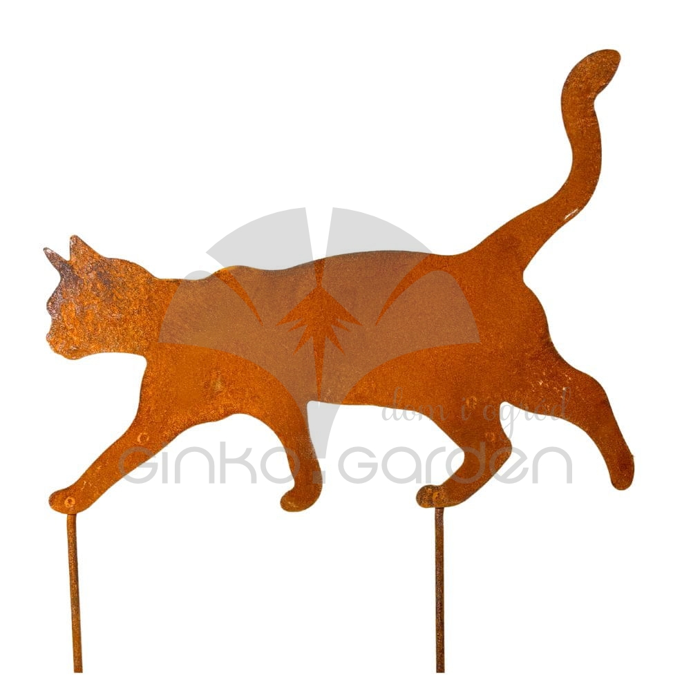 Metalowy kot na prętach pokryty naturalną rdzą – dekoracja ogrodowa w ruchu