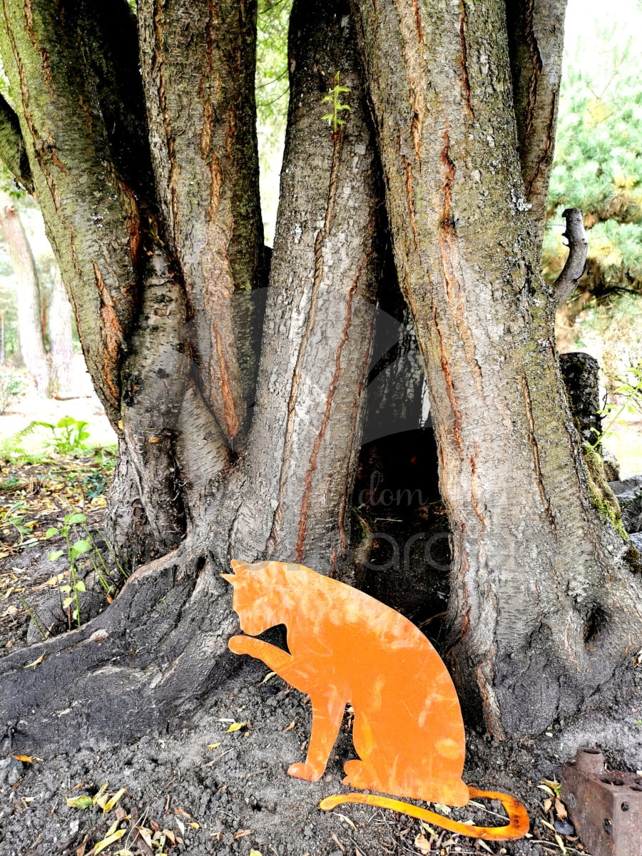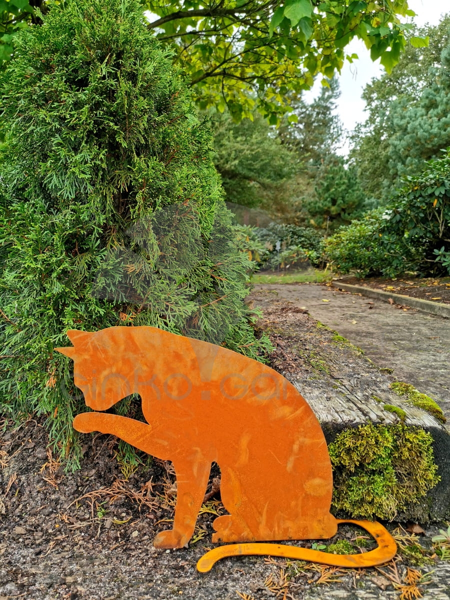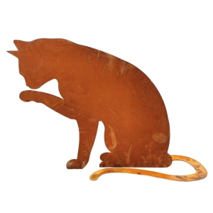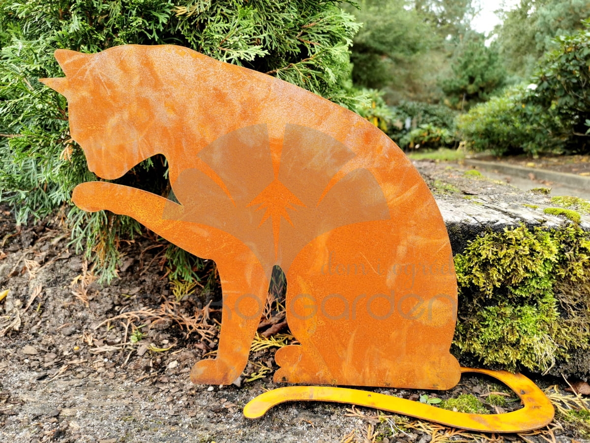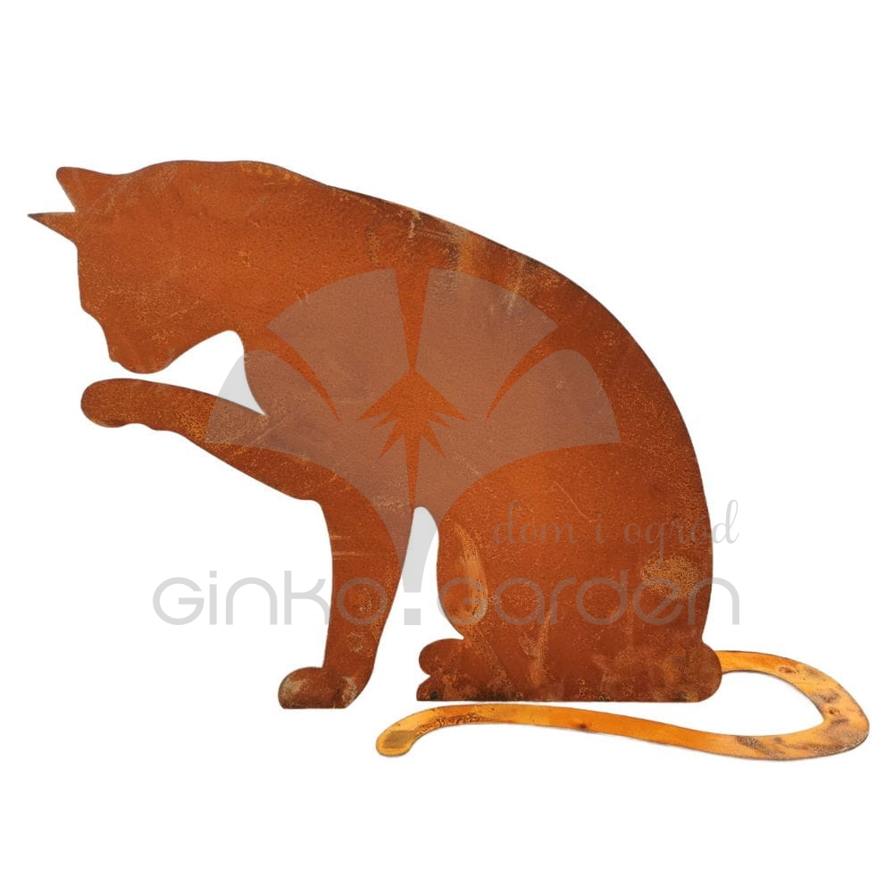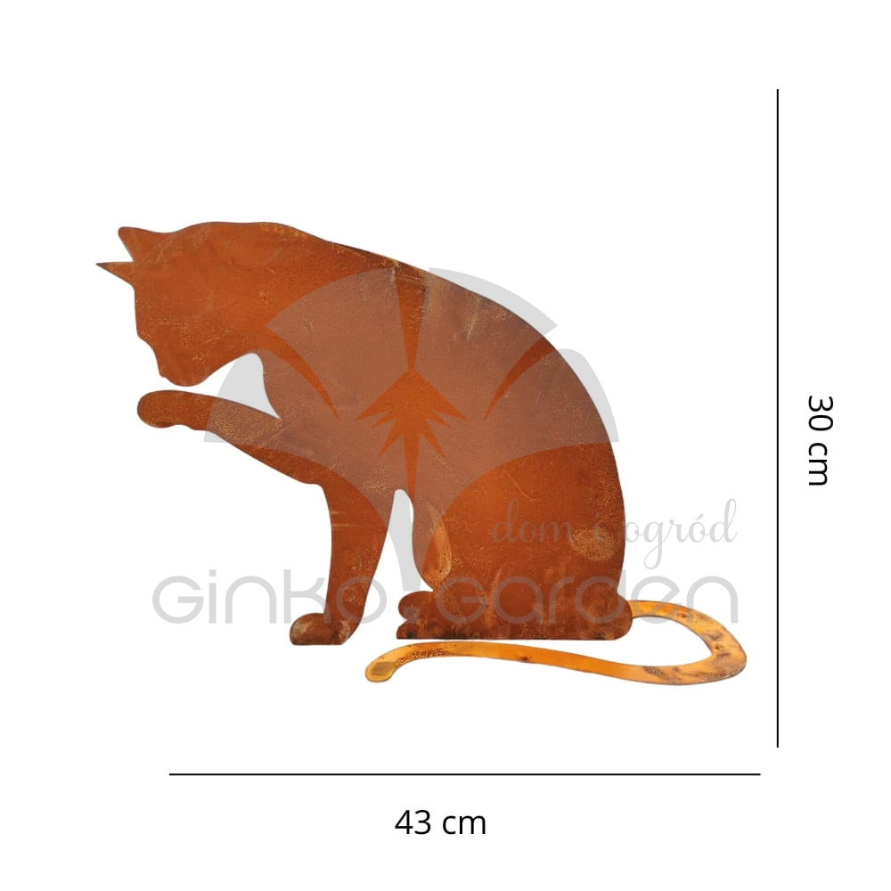 Metalowa figurka ogrodowa na w kształcie kota. Ozdoba wyprodukowana w Polsce, wykonana z wysokiej jakości stali pokrytej naturalną warstwą rdzy. Odporna na warunki atmosferyczne.