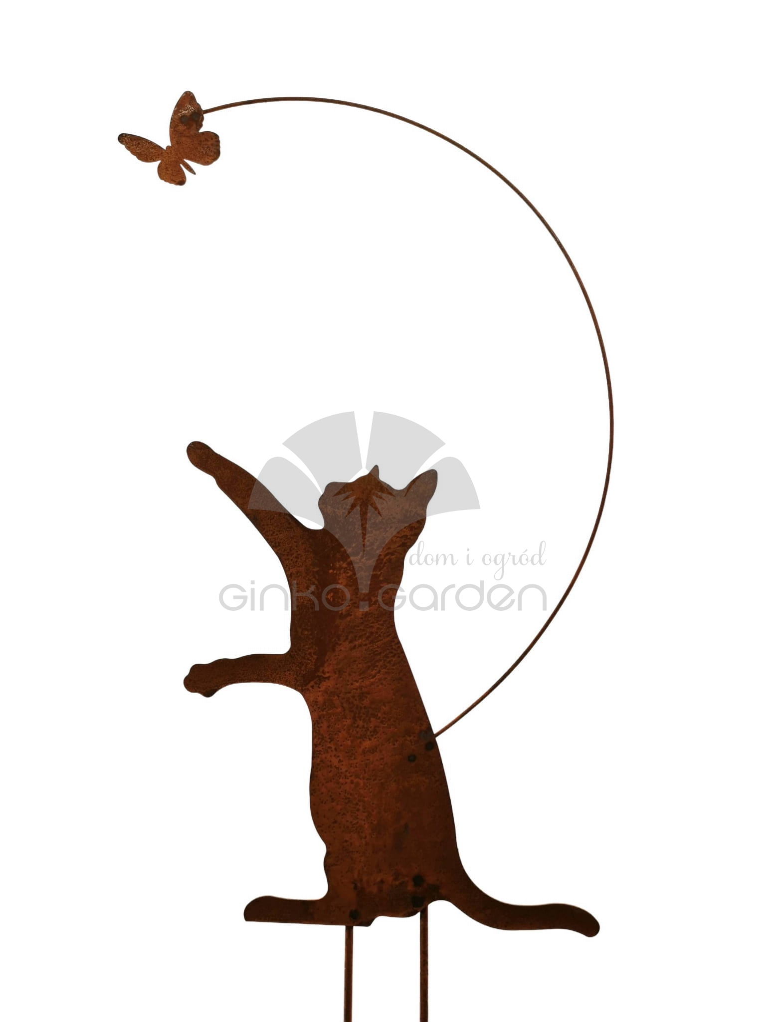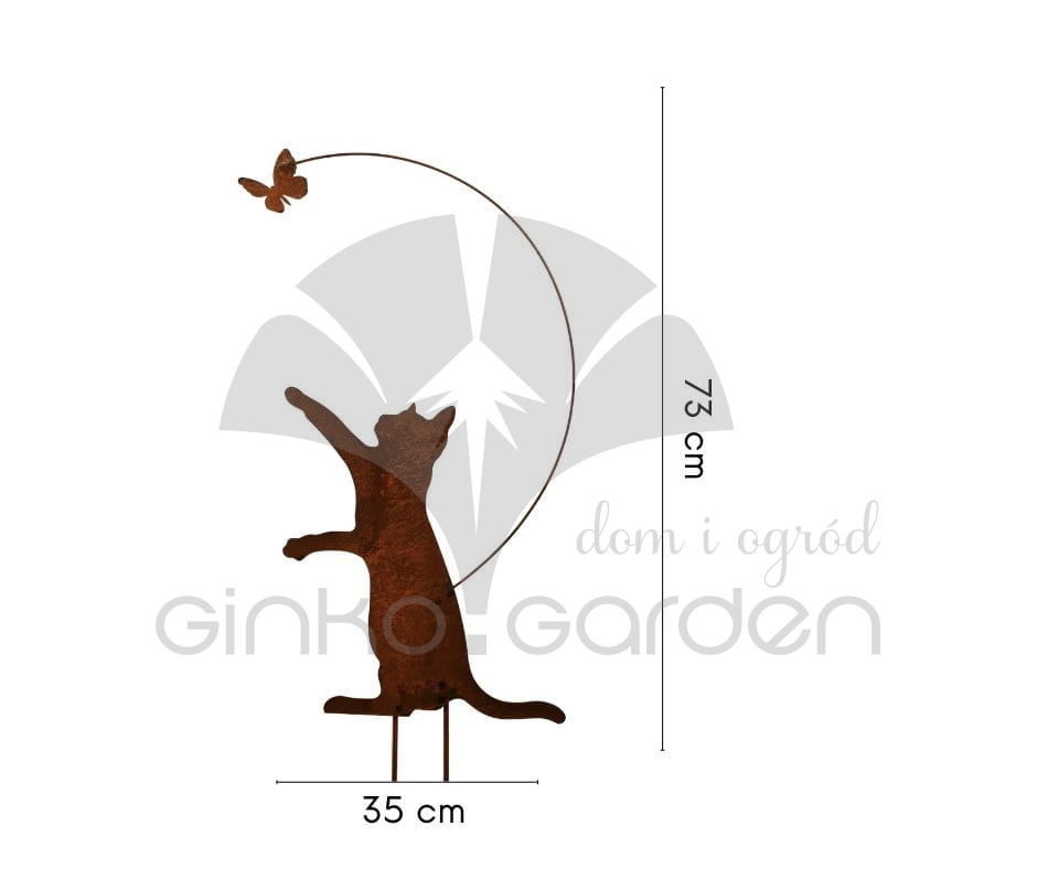 Figurka Kotka goniącego za motylkiem to uroczy element dekoracyjny, który wniesie zabawny i dynamiczny akcent do Twojego ogrodu. Wykonana w Polsce z wysokiej jakości stali, poddanej procesowi naturalnego rdzewienia, figurka zyskuje wyjątkowy, rustykalny charakter, idealnie komponujący się z zielenią i kwiatami.