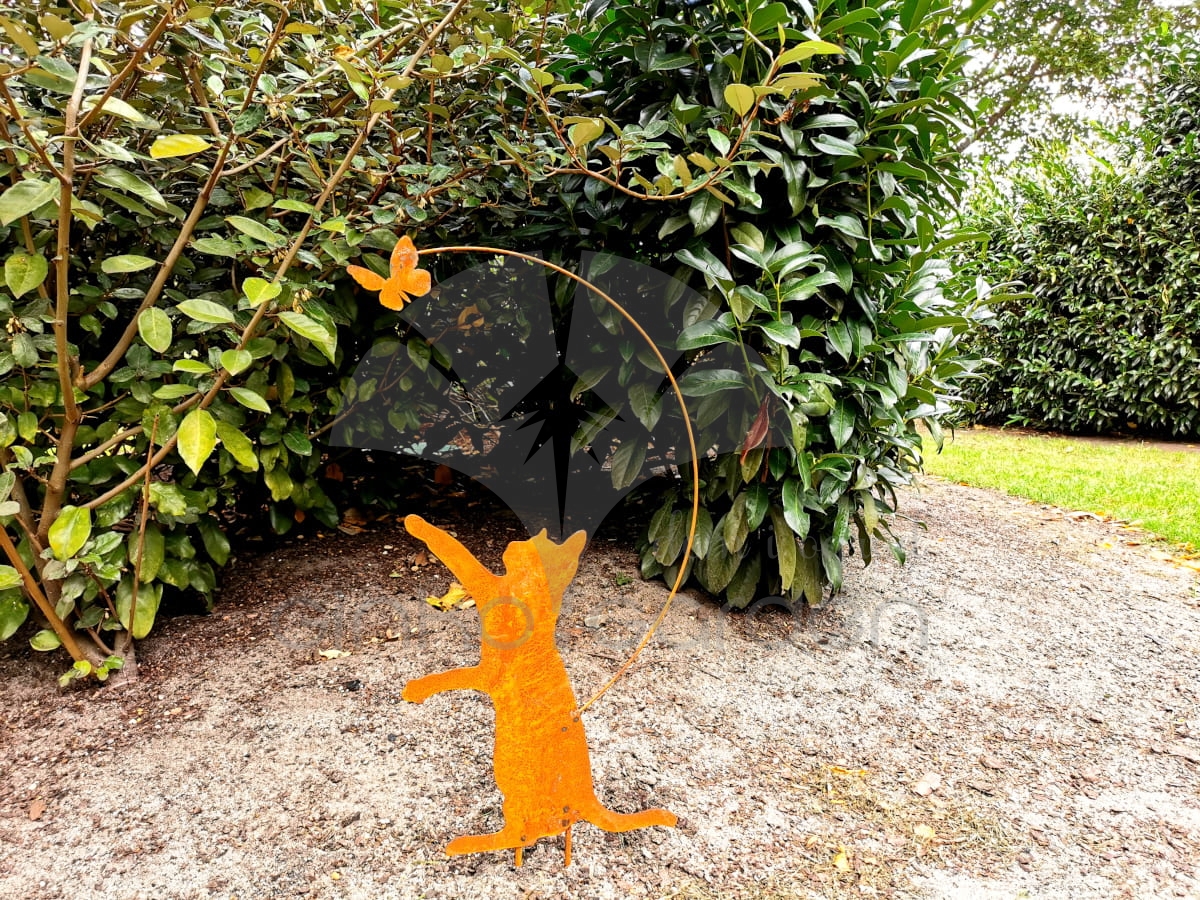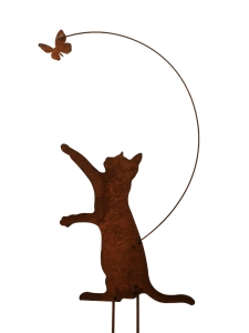 Metalowa figurka ogrodowa w kształcie kota bawiącego się z motylem, pokryta naturalną rdzą. Idealna dekoracja ogrodowa z metalu.