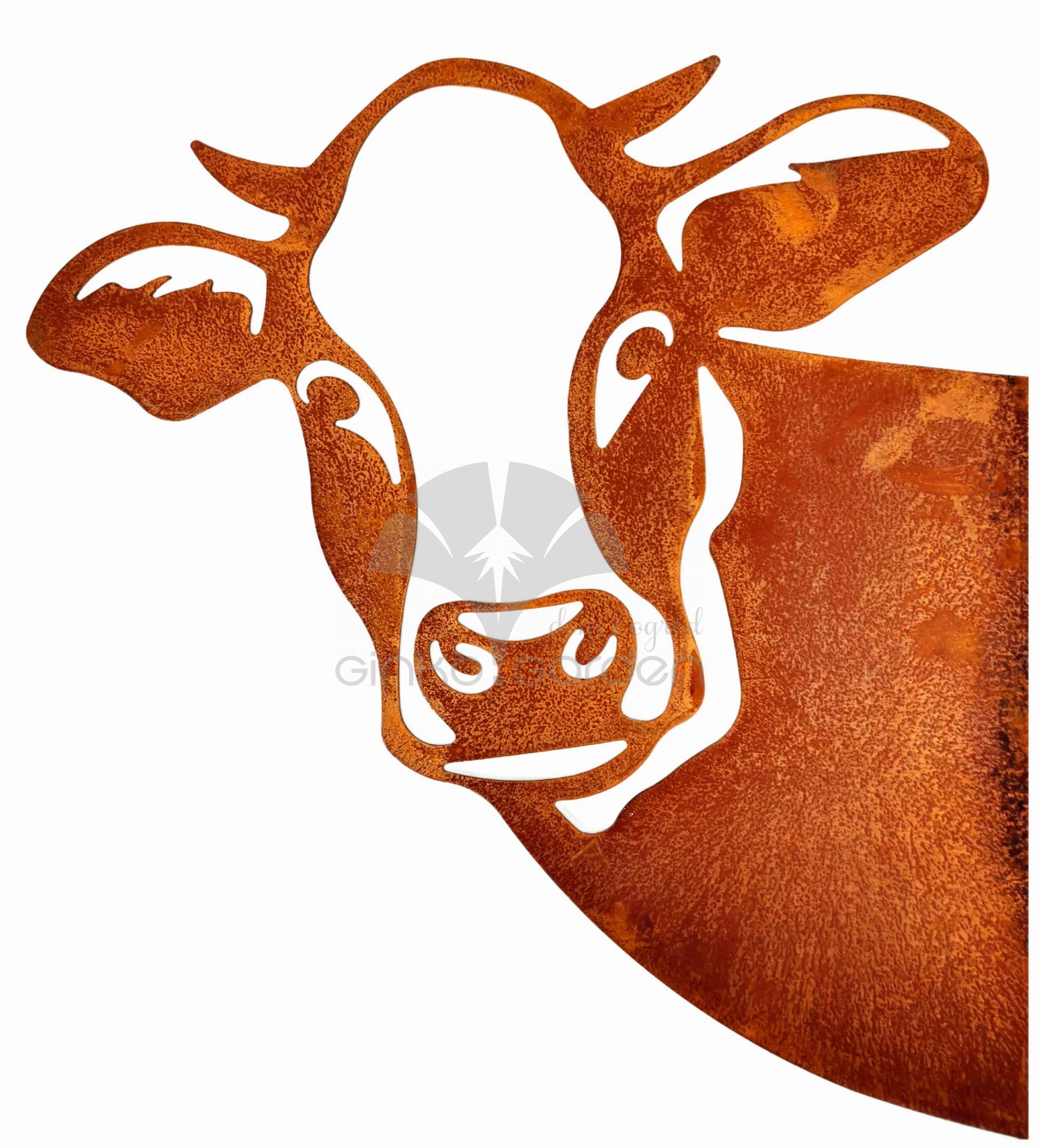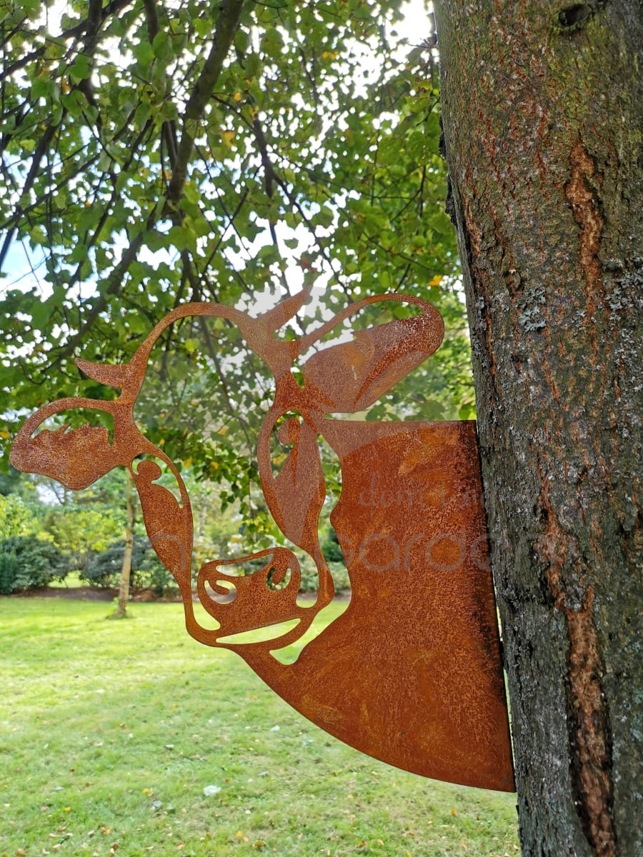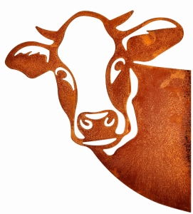 Głowa krowy Mućki do przykręcenia – metalowa ozdoba ogrodowa w kolorze naturalnej rdzy.
