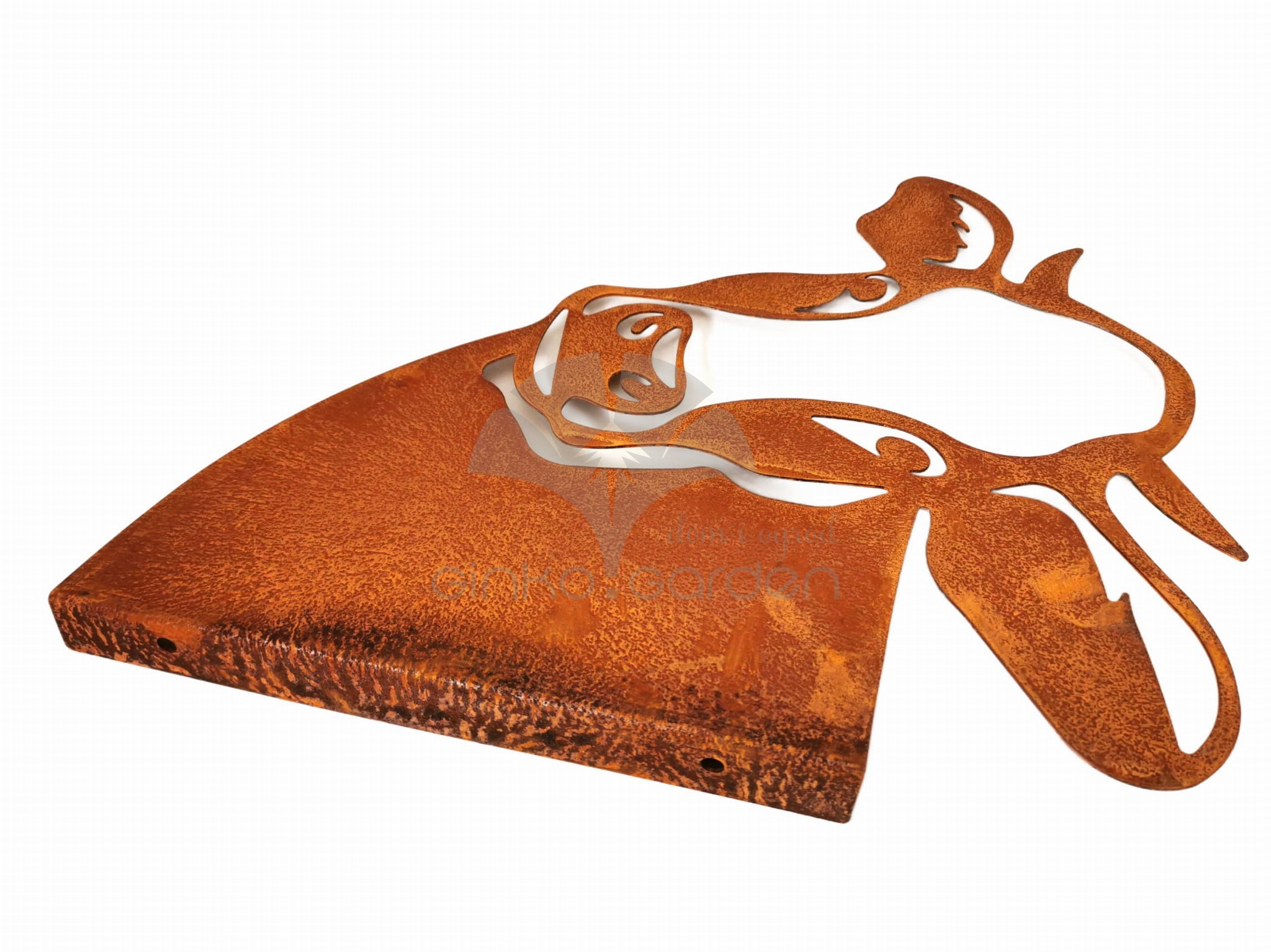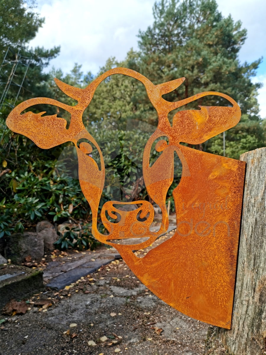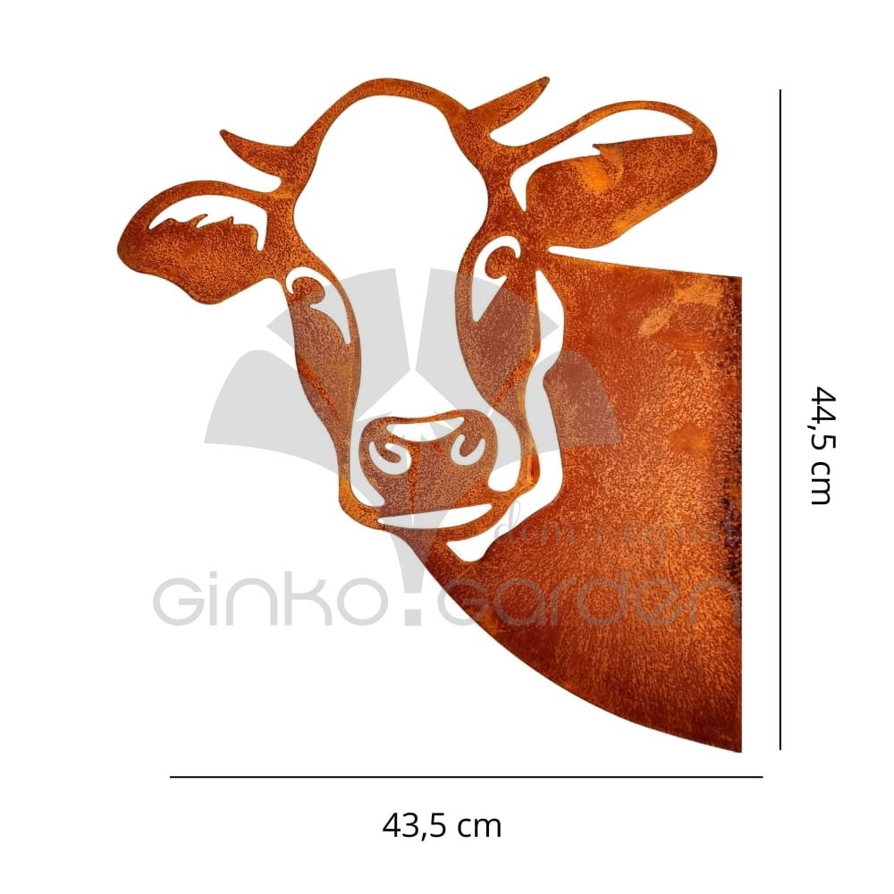Metalowa figurka ogrodowa w kształcie głowy krowy do przykręcenia na płocie, pokryta naturalną rdzą. Idealna dekoracja ogrodowa z metalu.
