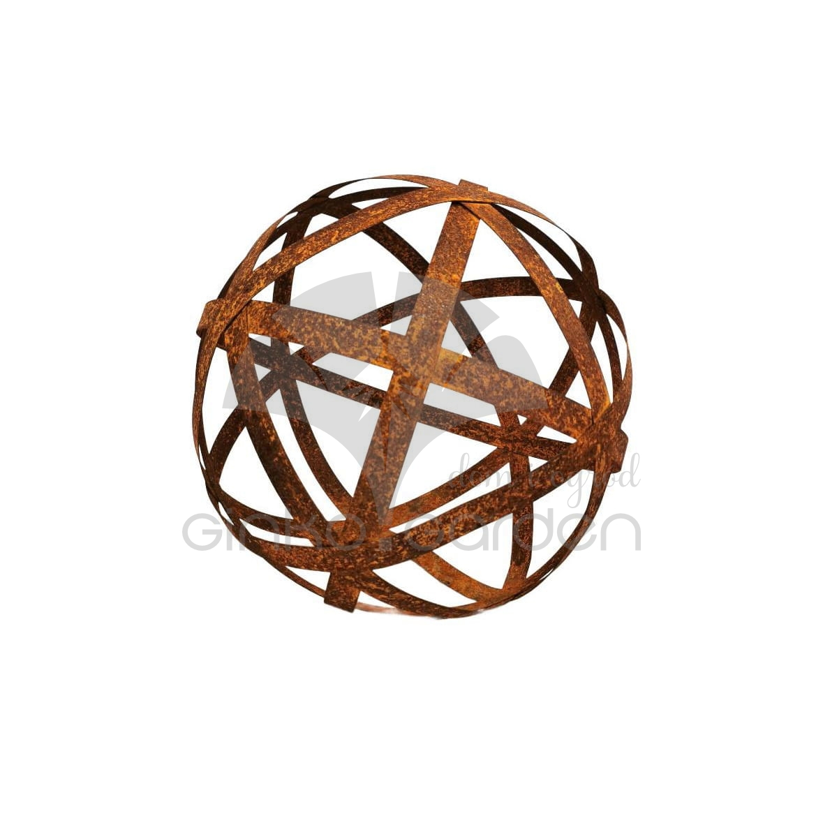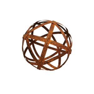 Ozdobna kula metalowa z pasków – lampion do ogrodu (D 20 cm) w kolorze naturalnej rdzy.