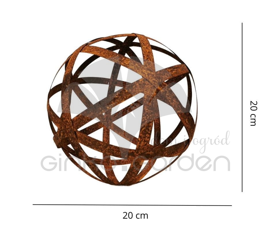 Metalowa ozdobna kula ogrodowa złożona z pasków o średnicy 20 cm. Dekoracja do ogrodu wykonana w Polsce z wysokiej jakości stali, pokrytej naturalną warstwą rdzy - odporna na warunki atmosferyczne.