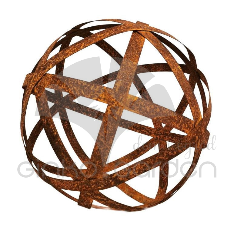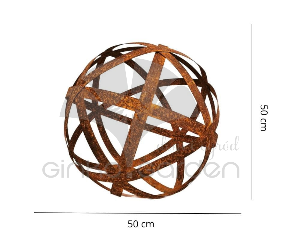Metalowa ozdobna kula ogrodowa złożona z pasków o średnicy 50 cm. Dekoracja do ogrodu wykonana w Polsce z wysokiej jakości stali, pokrytej naturalną warstwą rdzy - odporna na warunki atmosferyczne.