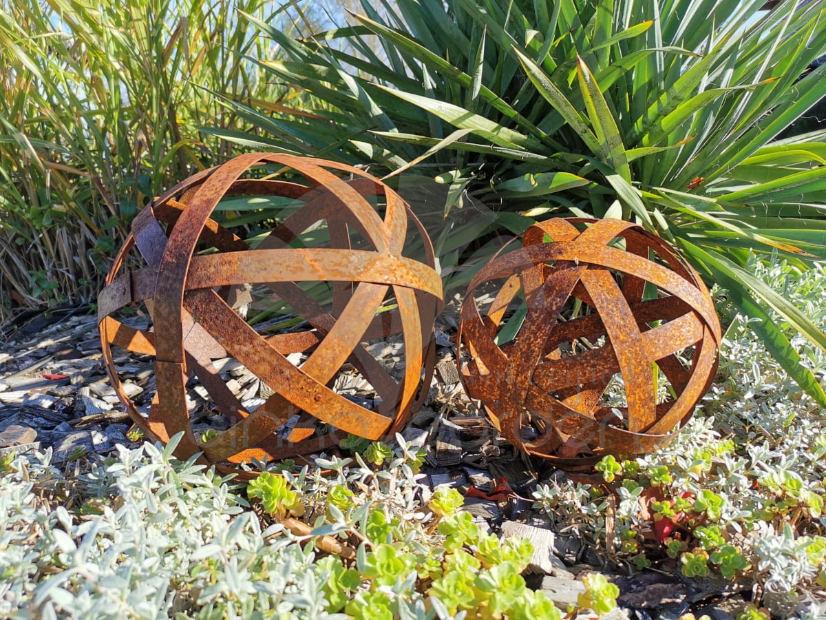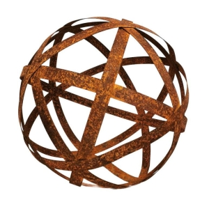 Ozdobna kula metalowa z pasków – lampion do ogrodu (D 50 cm) w kolorze naturalnej rdzy.