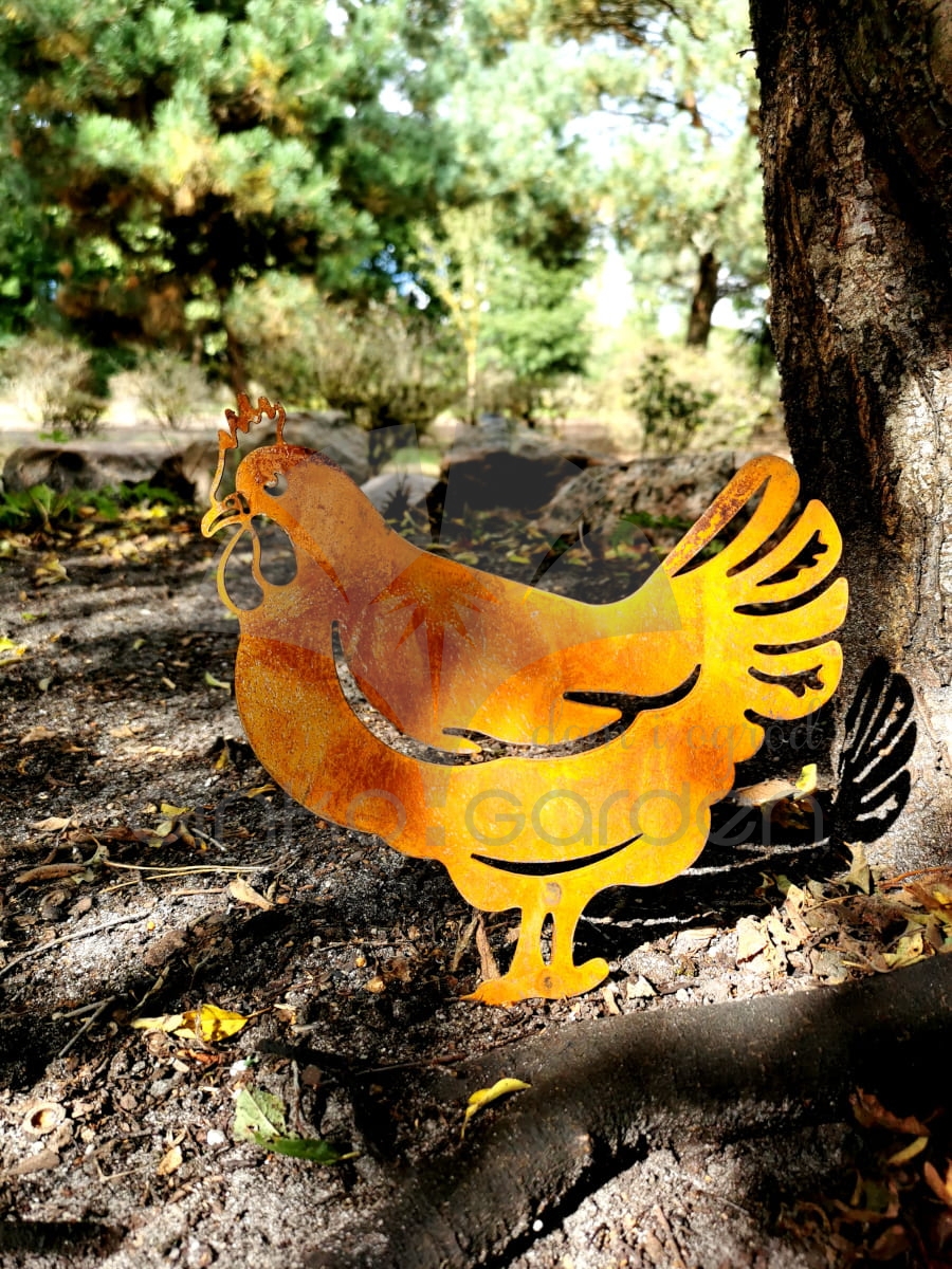 Metalowa figurka ogrodowa w kształcie kury Liwii, pokryta naturalną rdzą. Idealna dekoracja ogrodowa z metalu.