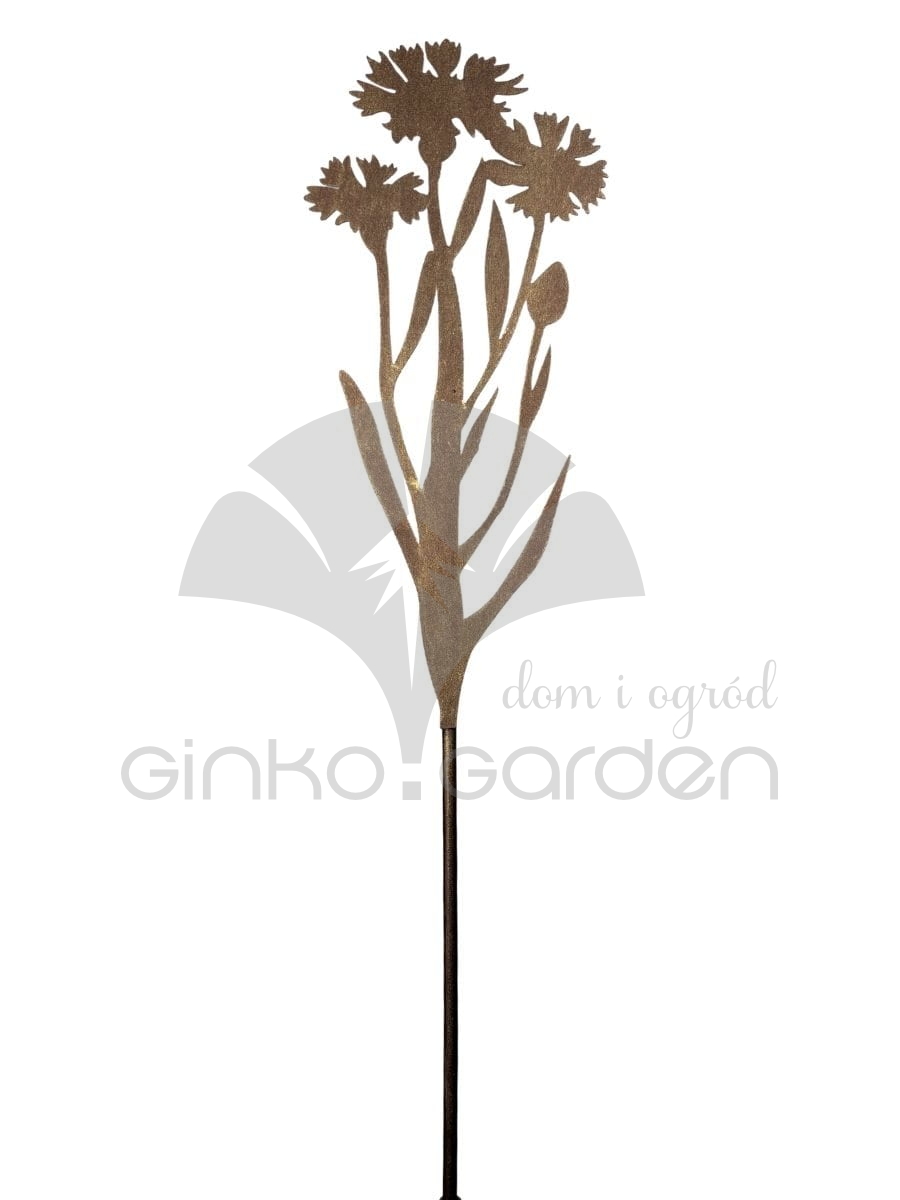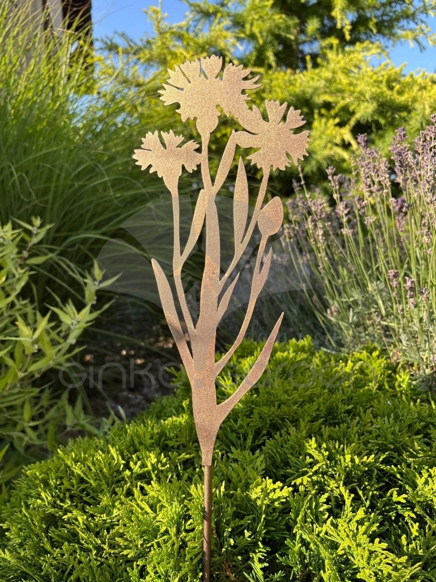 Metalowy kwiat chabra w kolorze złotej rdzy — subtelna dekoracja ogrodowa na pręcie, która doda Twojej przestrzeni lekkości i nowoczesnego charakteru.