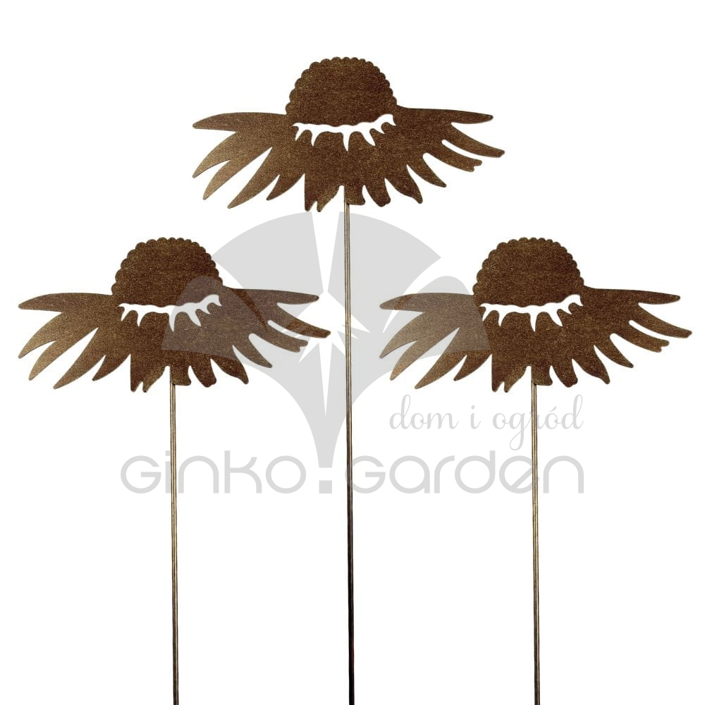 Zestaw trzech metalowych dekoracji ogrodowych - kwiatów jeżówki w kolorze złotej rdzy. Ozdoby metalowe najwyższej polskiej jakości, odporne na warunki atmosferyczne.
