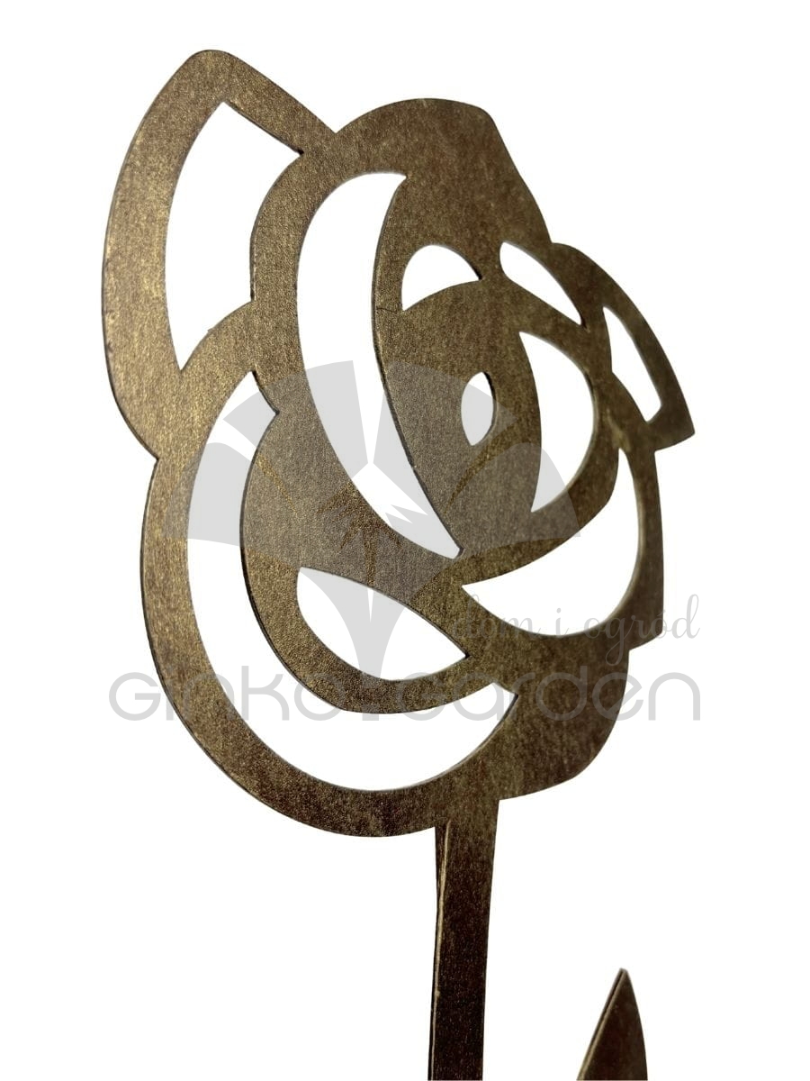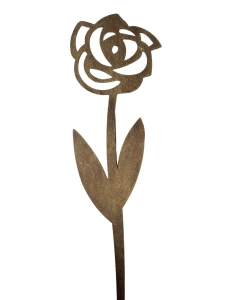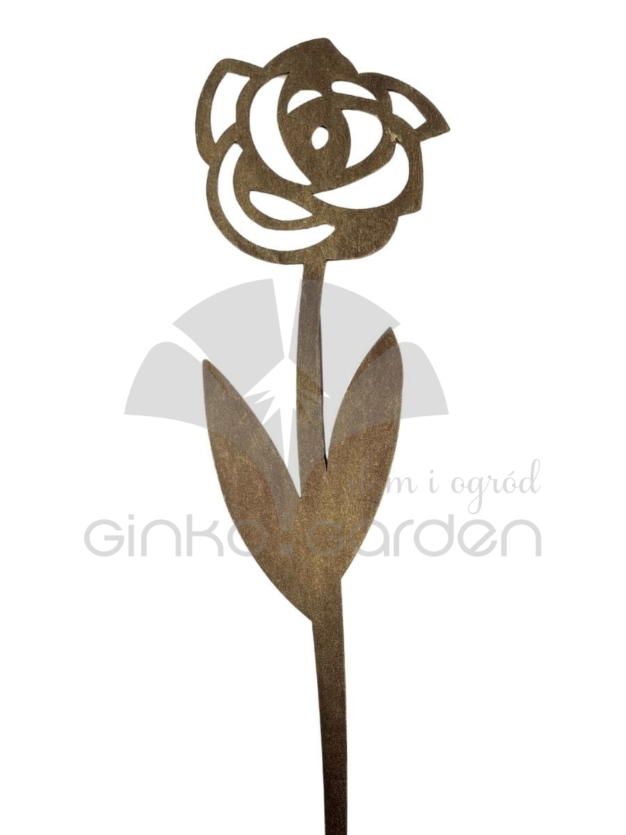Dekoracja ogrodowa róża z metalu - ozdoba na pręcie wykonana z wysokiej jakości stali, malowana proszkowo na kolor złotej rdzy- jest odporna na warunki atmosferyczne.