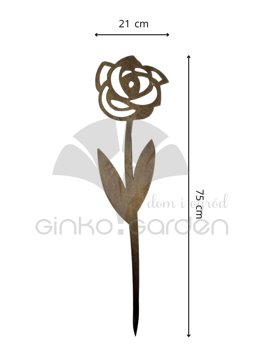 Dekoracja ogrodowa róża z metalu - ozdoba na pręcie wykonana z wysokiej jakości stali, malowana proszkowo na kolor złotej rdzy- jest odporna na warunki atmosferyczne.