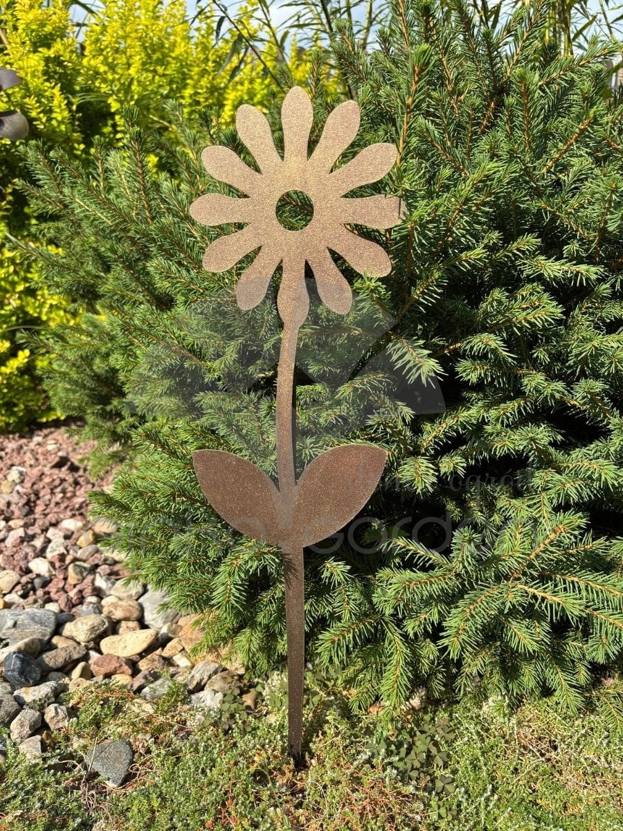 Ozdobny kwiat stokrotki w kolorze złotej rdzyto idealne uzupełnienie każdego ogrodu. Wykonana z wysokiej jakości stali dekoracja ogrodowa, odporna na warunki atmosferyczne.