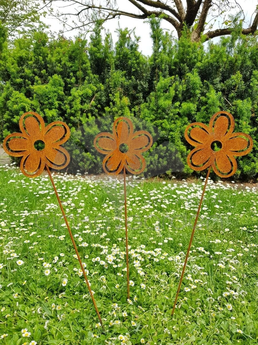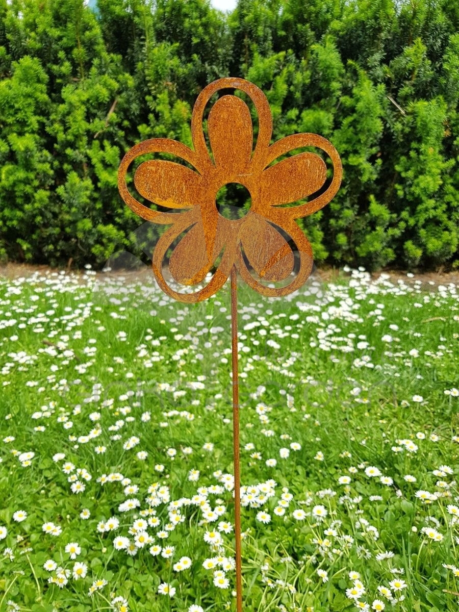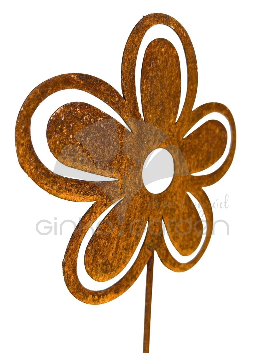 Metalowy kwiat na pręcie 60 cm - rdzawa dekoracja w formie aksamitki