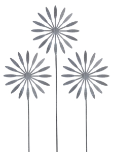 Zestaw trzech sztuk dekoracji metalowych na pręcie - kwiatów dmuchawców. Kwiaty wykonane zostały z wysokiej jakości stali i pokryte farbą proszkową w kolorze antracytowym. Ozdoby są odporne na warunki atmosferyczne.