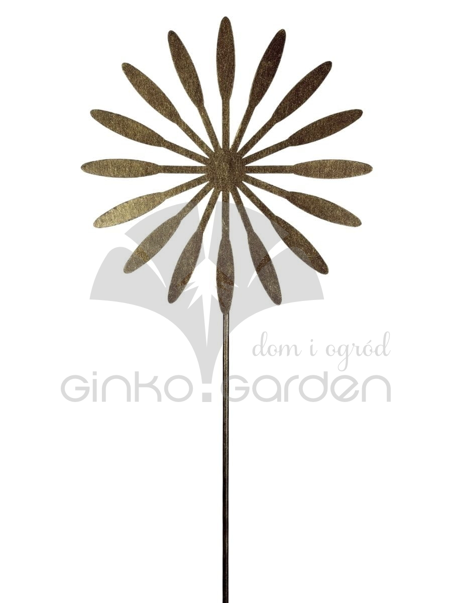 Zestaw trzech sztuk dekoracji metalowych na pręcie - kwiatów dmuchawców. Kwiaty wykonane zostały z wysokiej jakości stali i pokryte farbą proszkową w kolorze złotej rdzy. Ozdoby są odporne na warunki atmosferyczne.