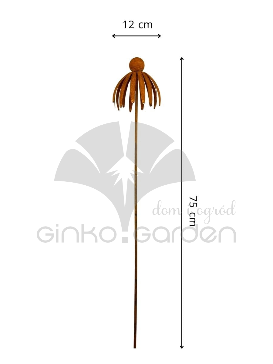 Wykonana z trwałego metalu, dekoracja jeżówki została zaprojektowana z myślą o długotrwałym użytkowaniu na zewnątrz. Naturalna rdza i solidna kmonstrukcja gwarantują jej odporność na warunki atmosferyczne i zapewniają estetyczny wygląd przez wiele sezonów. Stabilny pręt umożliwia łatwe wbicie ozdoby w ziemię, dzięki czemu można ją umieścić wśród rabat, przy ścieżkach lub w donicach.