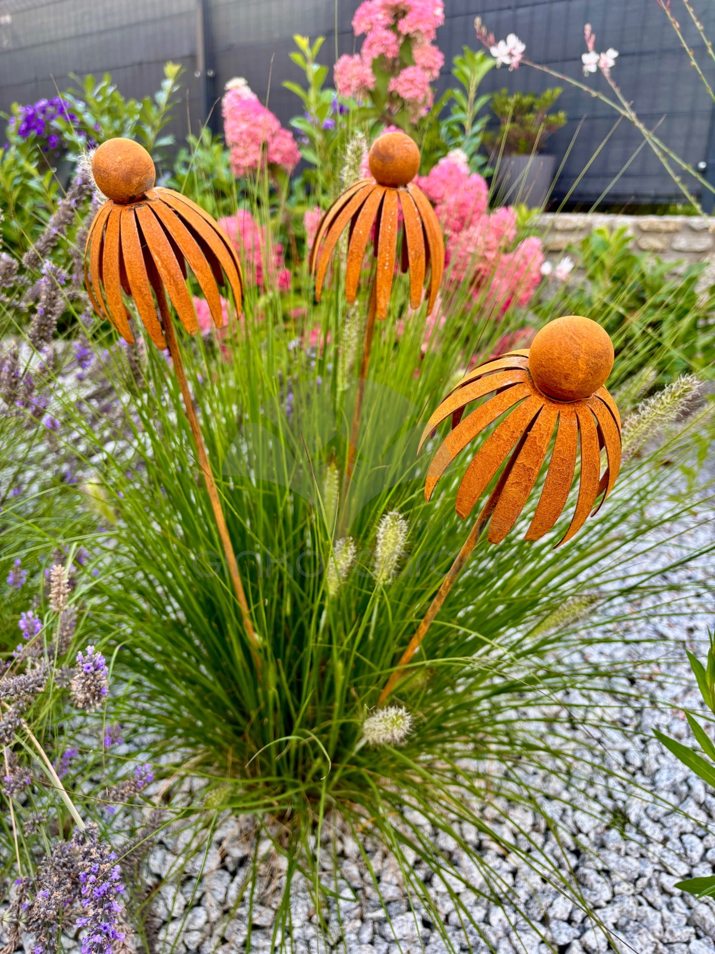 Metalowa dekoracja ogrodowa 3D w kształcie kwiatu jeżówki, wykończona naturalną rdzą, na pręcie do wbicia w ziemię.