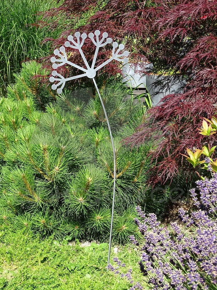 Wzbogać swój ogród o stylową i nowoczesną kompozycję dzięki zestawowi trzech wyjątkowych dekoracji w kształcie kwiatów pietruszki. Te ażurowe, lekkie formy na smukłych prętach to subtelna ozdoba, która nadaje przestrzeni artystycznego charakteru i elegancji – przez cały rok, niezależnie od pogody. Trzy sztuki pozwalają na stworzenie przestrzennej instalacji – możesz je ustawić w różnych wysokościach i konfiguracjach, dzięki czemu uzyskasz efekt głębi i naturalnego ruchu, jakby rośliny poruszały się na wietrze. Idealnie prezentują się w grupie, zwłaszcza wśród rabat, traw ozdobnych, lawendy czy w donicach. Każda dekoracja wykonana jest z wytrzymałego metalu i malowana proszkowo na elegancki kolor antracytowy. Ta technika zabezpiecza przed korozją, promieniowaniem UV i deszczem, dzięki czemu ozdoby wyglądają jak nowe przez wiele sezonów. Metalowe pręty z łatwością wbijesz w ziemię - możesz je dowolnie przestawiać i tworzyć nowe aranżacje – wzdłuż ścieżki, przy wejściu, w warzywniku czy na tarasie.