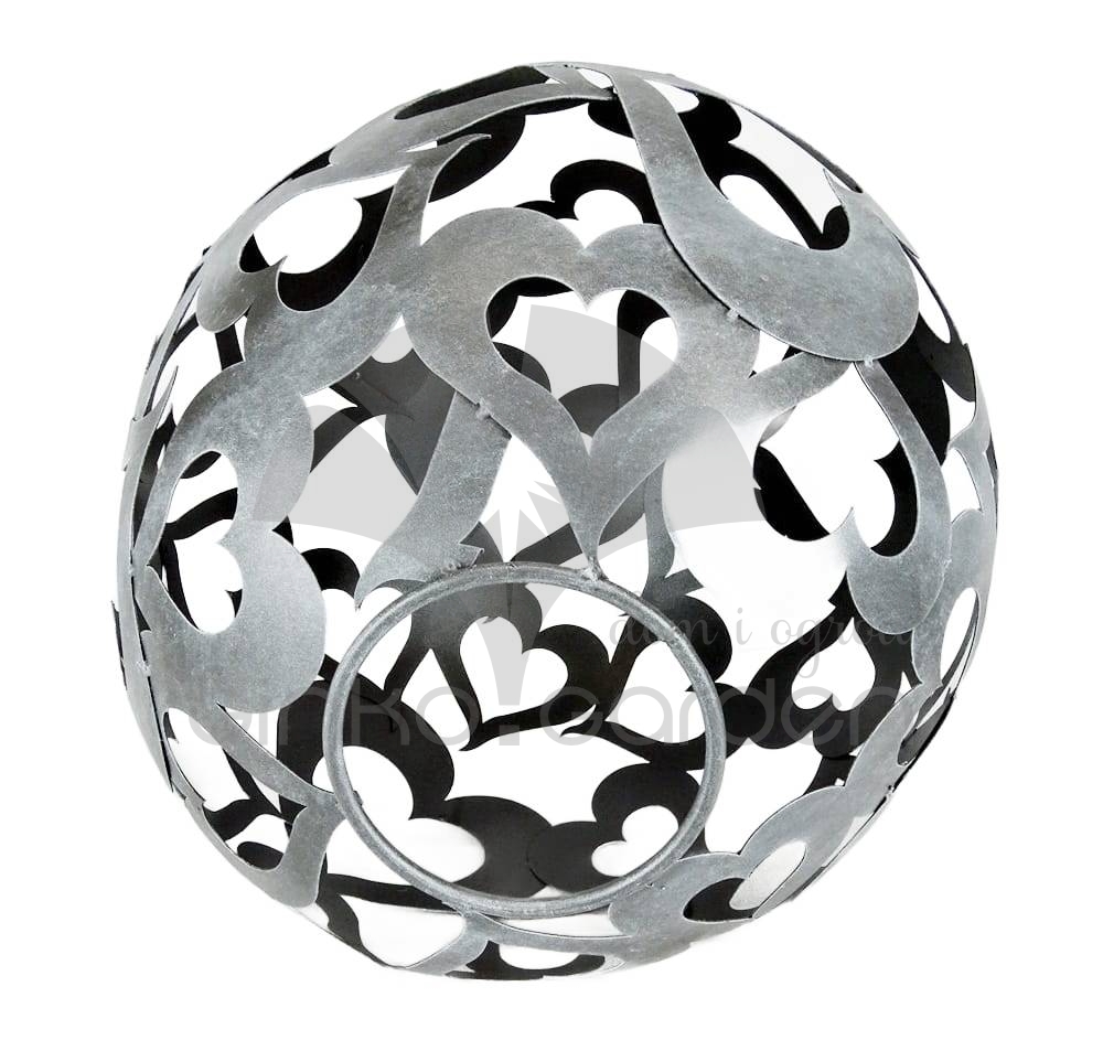 Metalowa ozdobna kula ogrodowa złożona z serc. Dekoracja do ogrodu wykonana w Polsce z wysokiej jakości stali, pomalowana proszkowo na kolor antracytowy - odporna na warunki atmosferyczne.