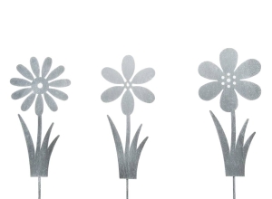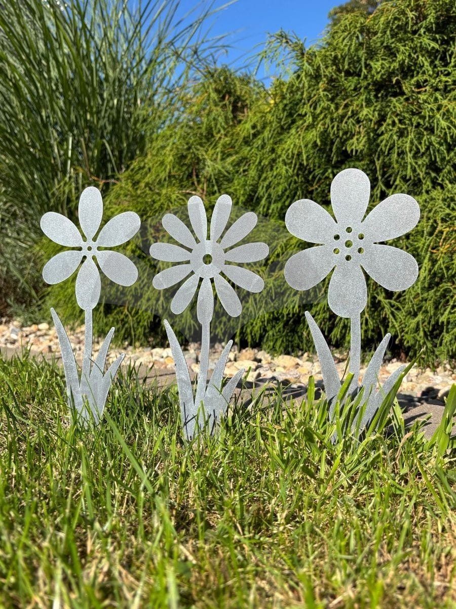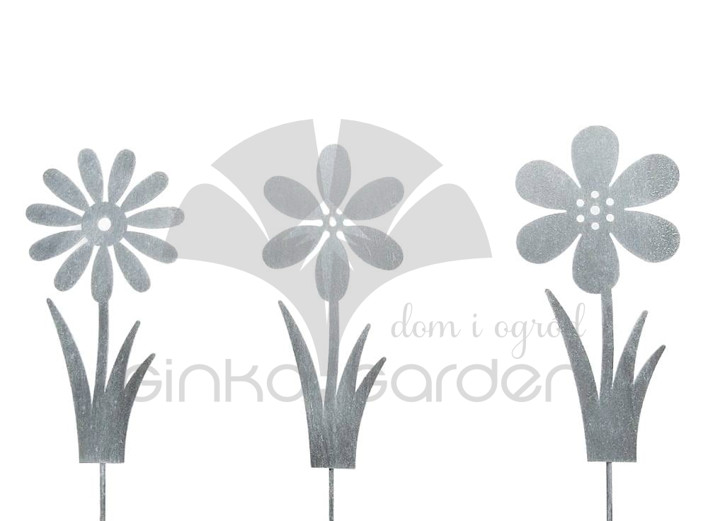 Zestaw trzech metalowych kwiatków do dekorowania. Trzy wzory ozdób ogrodowych wykonanych w Polsce z wysokiej jakości stali. Pomalowane proszkowo na kolor antracytowy, odporne na warunki atmosferyczne.