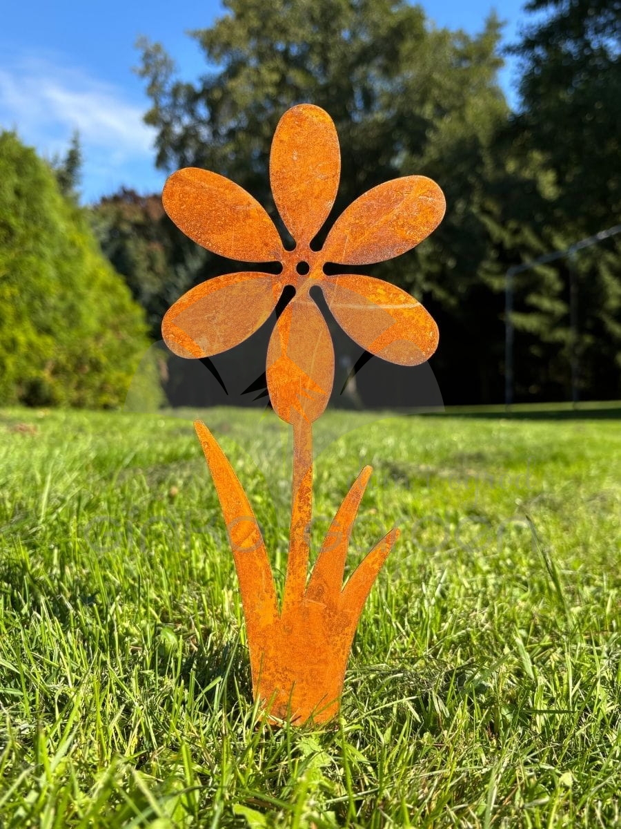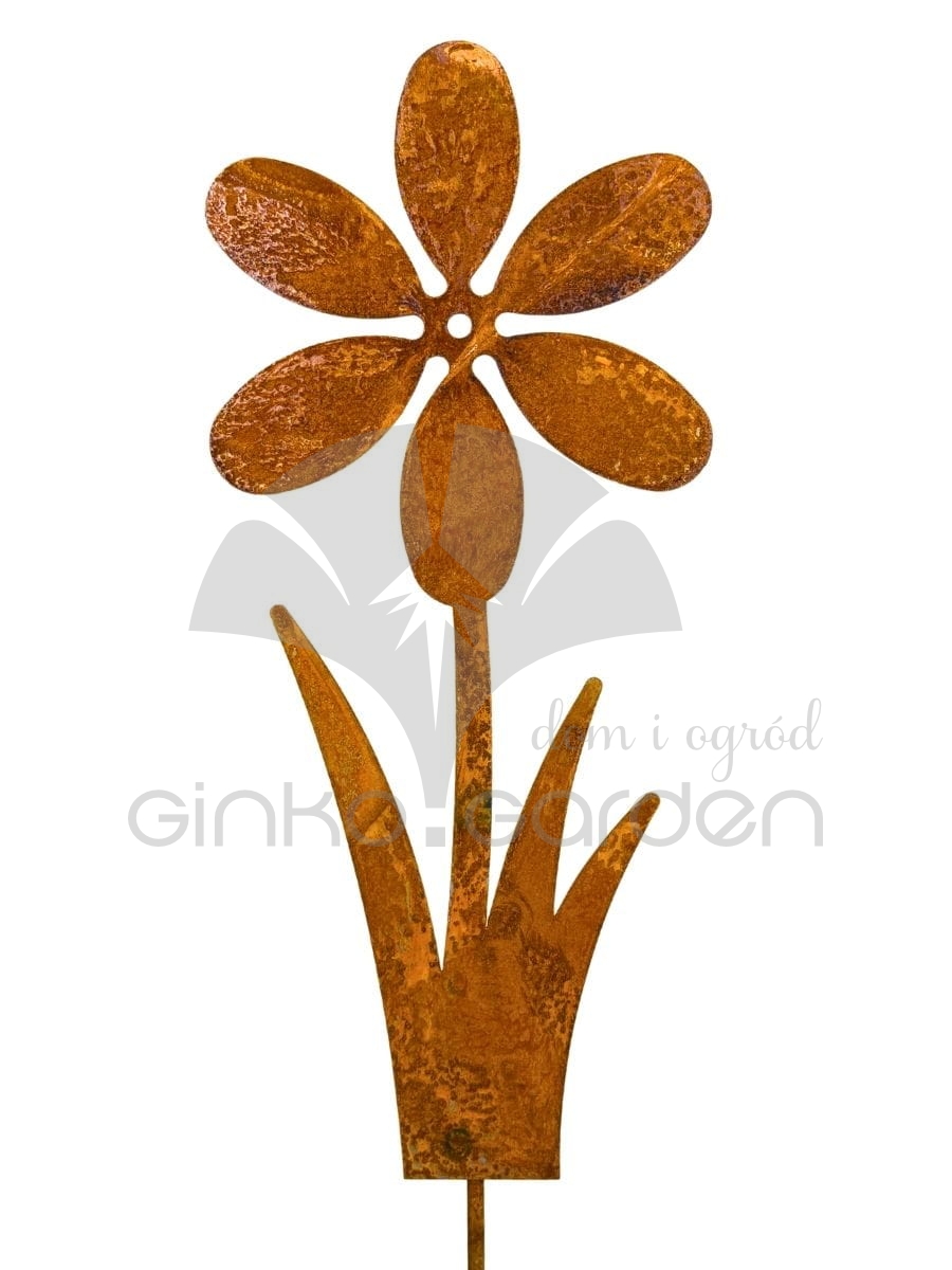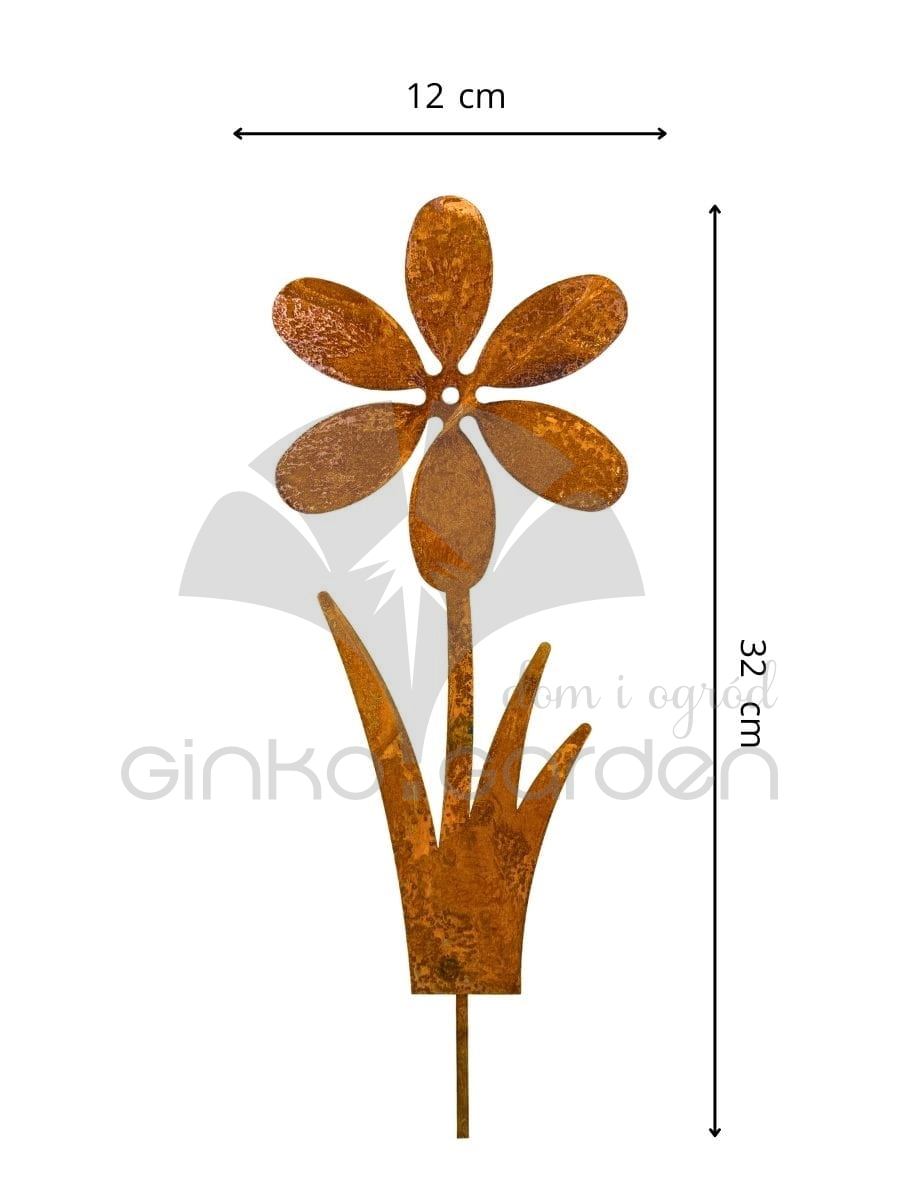 Dekoracja ogrodowa z metalu w kształcie kwiatu z trawą. Wykonana z wysokiej jakości stali, pokryta naturalną warstwą rdzy - jest odporna na warunki atmosferyczne.