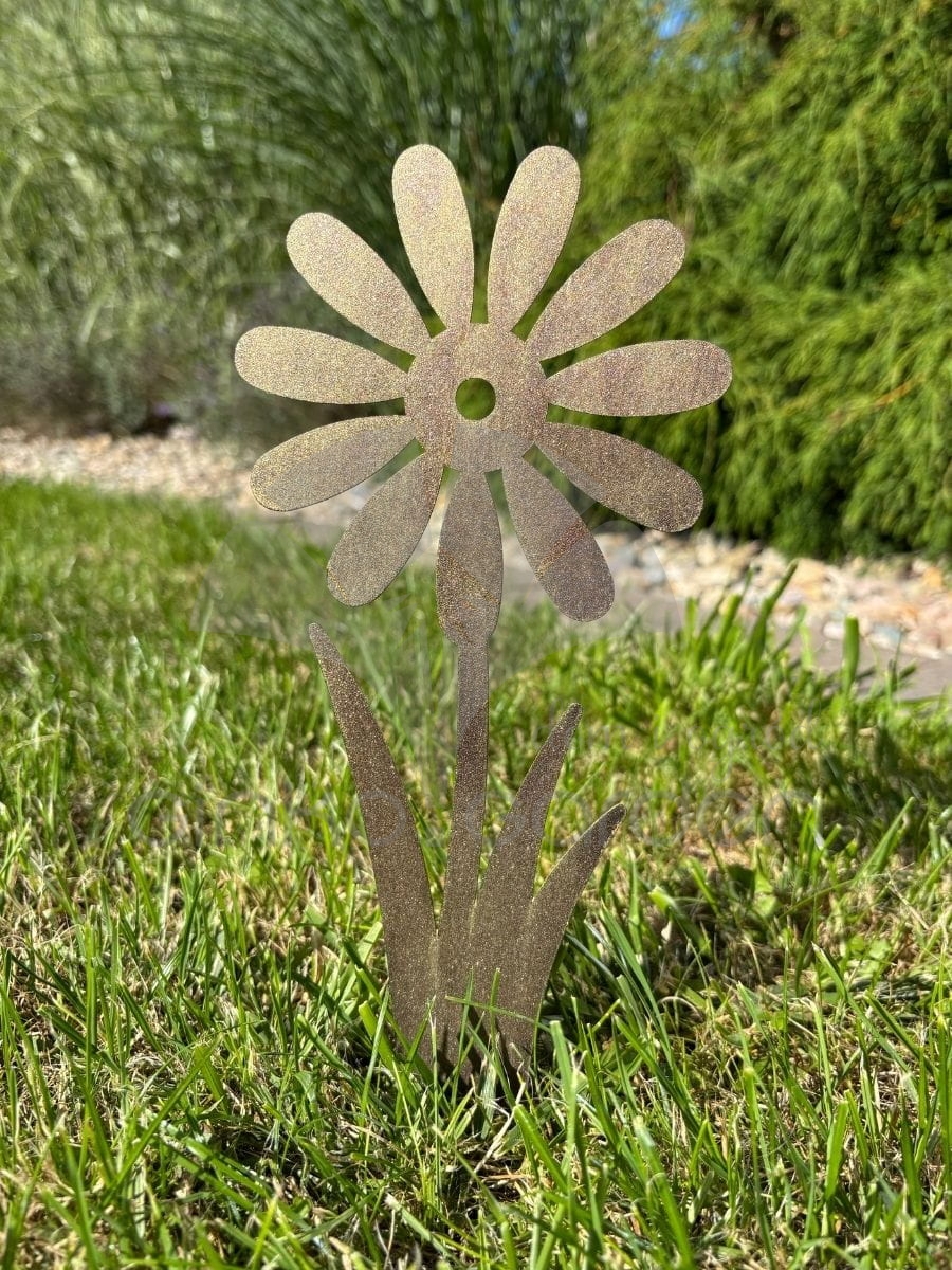 Wprowadź do swojego ogrodu subtelny, a jednocześnie stylowy akcent dzięki tej wyjątkowej dekoracji z metalu przedstawiającej kwiat margaretki z ozdobną trawą. Wykonana z trwałej stali i malowana proszkowo na elegancki kolor złotej rdzy, idealnie komponuje się zarówno z nowoczesnymi, jak i rustykalnymi aranżacjami przestrzeni zielonej. Dekoracja ogrodowa osadzona jest na smukłym pręcie, który umożliwia łatwe umieszczenie jej w ziemi, donicy czy rabacie. Starannie wycięty wzór kwiatu nadaje całości lekkości i oryginalnego charakteru. Dzięki połączeniu z motywem trawy, ozdoba nabiera naturalnego i harmonijnego wyglądu. To doskonały wybór dla osób, które chcą dodać ogrodowi artystycznego wyrazu bez potrzeby intensywnej pielęgnacji. Nasza ozdoba z metalu jest odporna na warunki atmosferyczne – będzie cieszyć oko przez wiele sezonów.