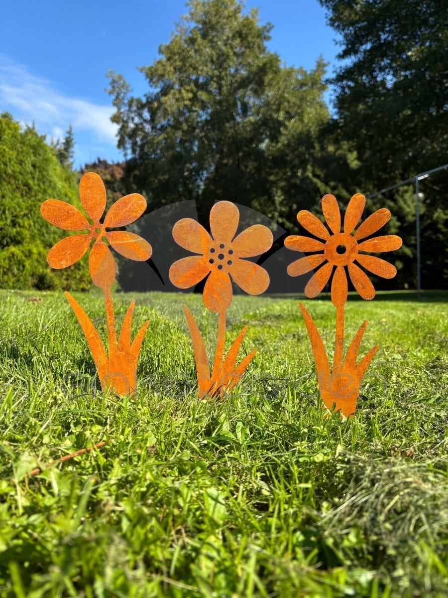 Dekoracja ogrodowa z metalu w kształcie kwiatu z trawą. Wykonana z wysokiej jakości stali, pokryta naturalną warstwą rdzy - jest odporna na warunki atmosferyczne.