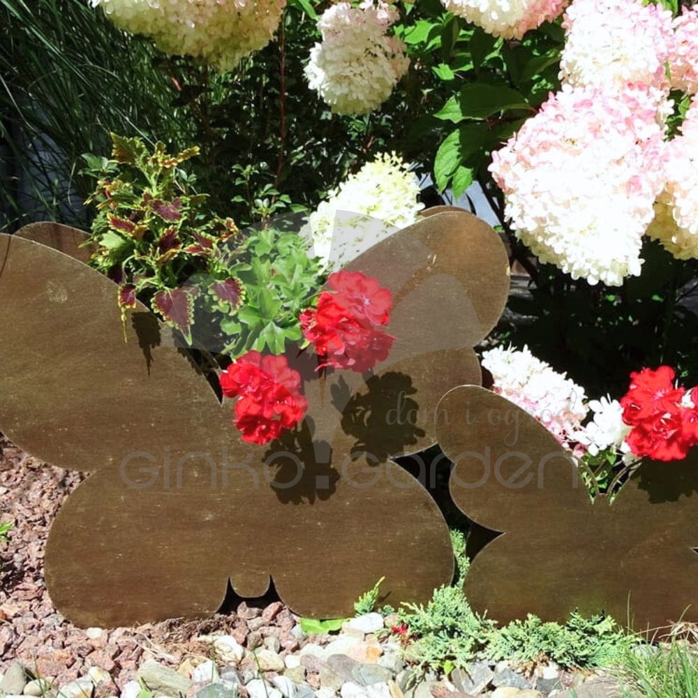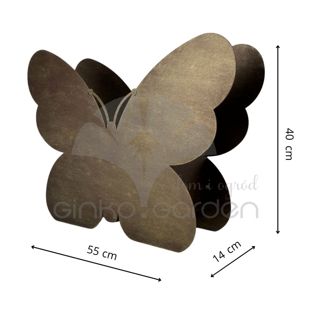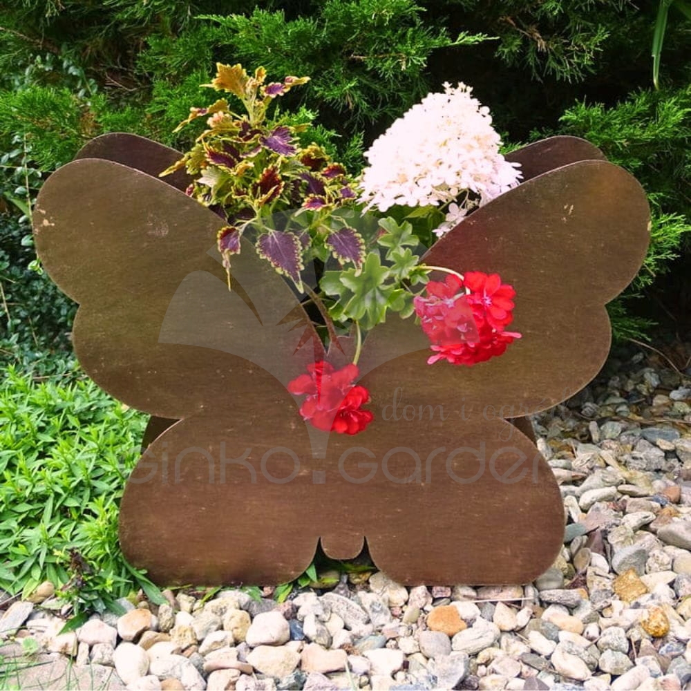 Doniczka ozdobna z metalu w kształcie motyla. Dekoracja do sadzenia roślin wykonana w Polsce, z wysokiej jakości stali pomalowanej proszkowo na kolor złotej rdzy. Odporna na warunki atmosferyczne.