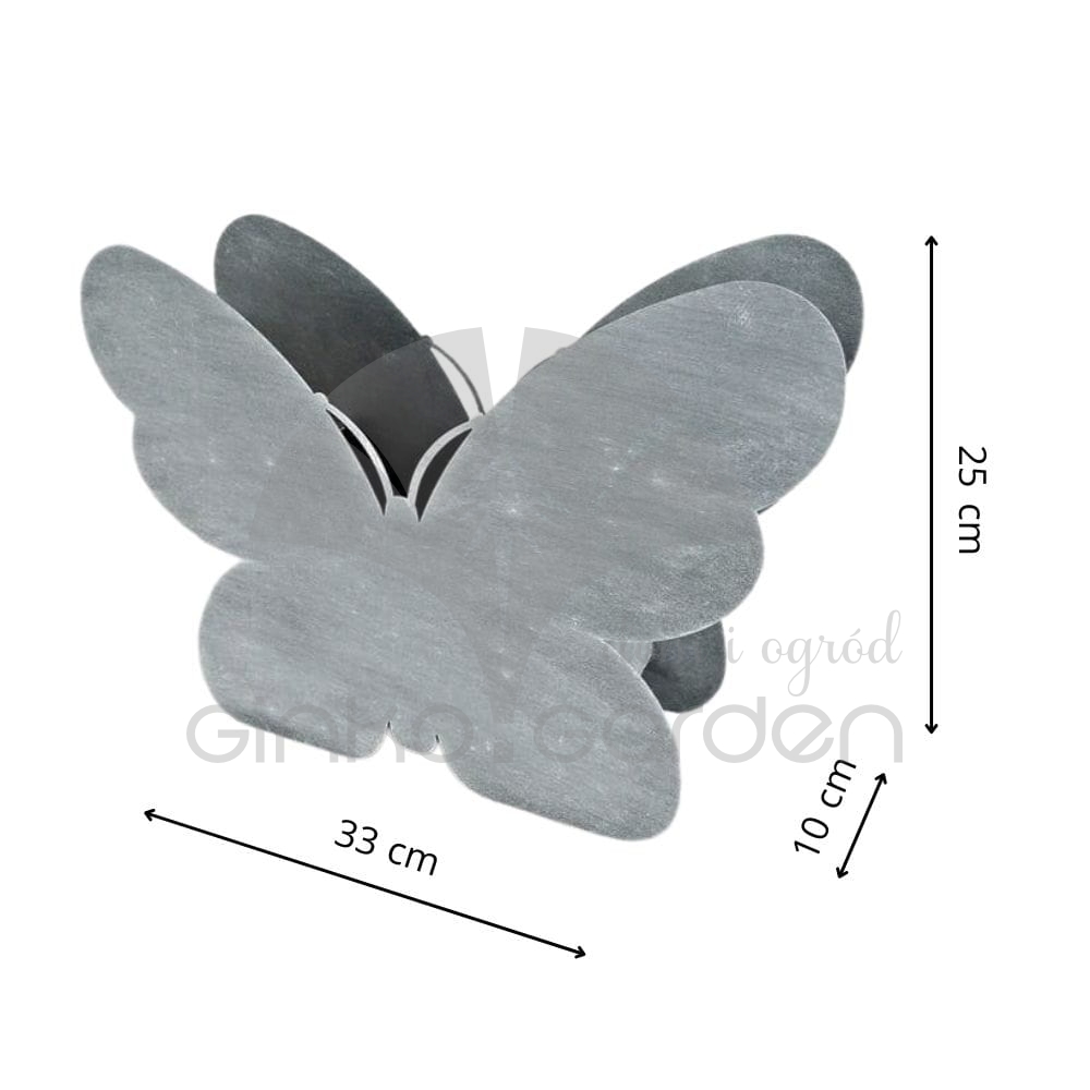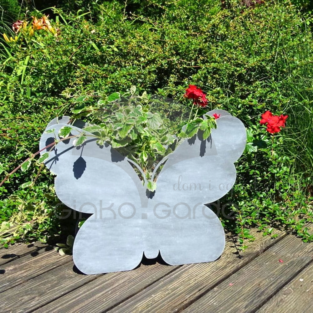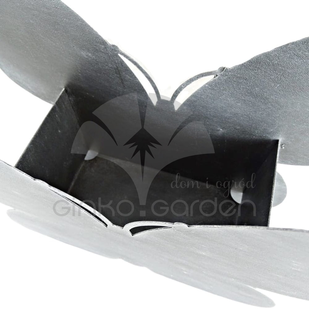 Doniczka ozdobna z metalu w kształcie motyla. Dekoracja do sadzenia roślin wykonana w Polsce, z wysokiej jakości stali pomalowanej proszkowo na kolor antracytowy. Odporna na warunki atmosferyczne.