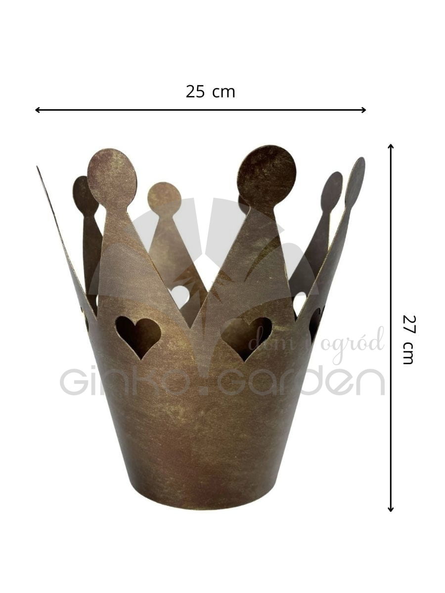 Efektowna doniczka w kształcie korony, wykonana z wysokiej jakości metalu i pokryta odporną na warunki atmosferyczne powłoką w odcieniu złotej rdzy. Stanowi wyjątkową dekorację ogrodową — elegancka i stylowa oprawa dla Twoich ulubionych roślin.