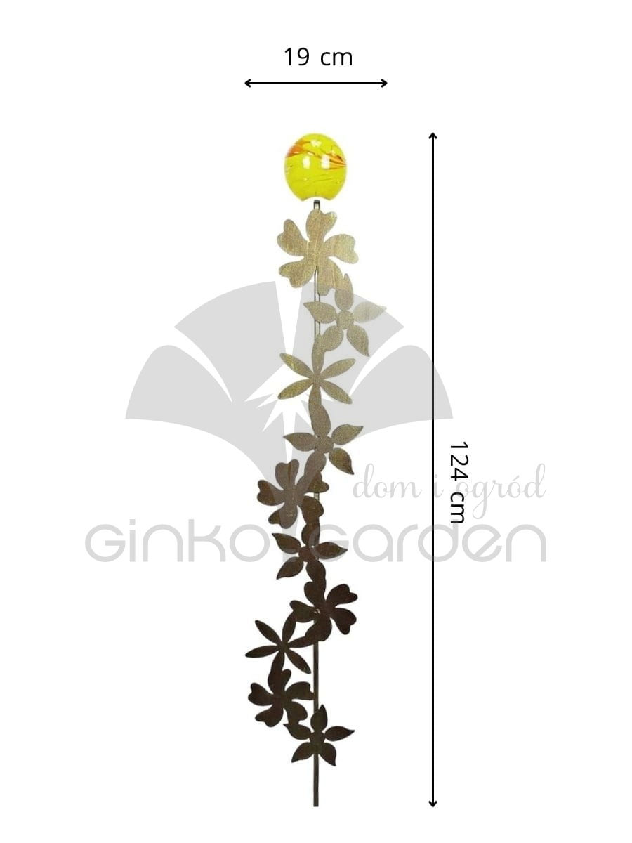 Podpora ogrodowa z metalu - kwiaty na pręcie. Dekoracja metalowa z żółto-pomarańczową kulą szklaną na szczycie. Wykonana z wysokiej jakości stali, malowana proszkowo na kolor złotej rdzy - odporna na warunki atmosferyczne.