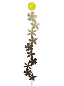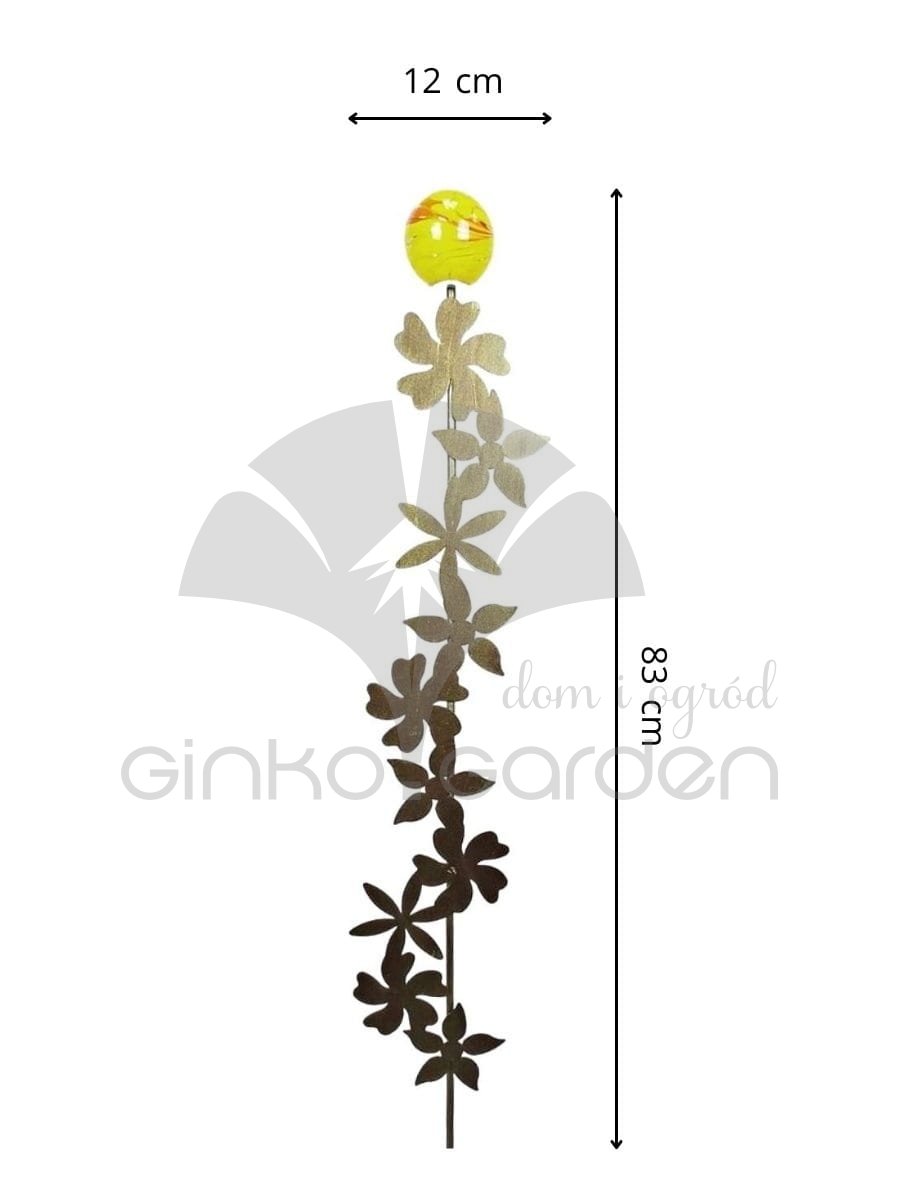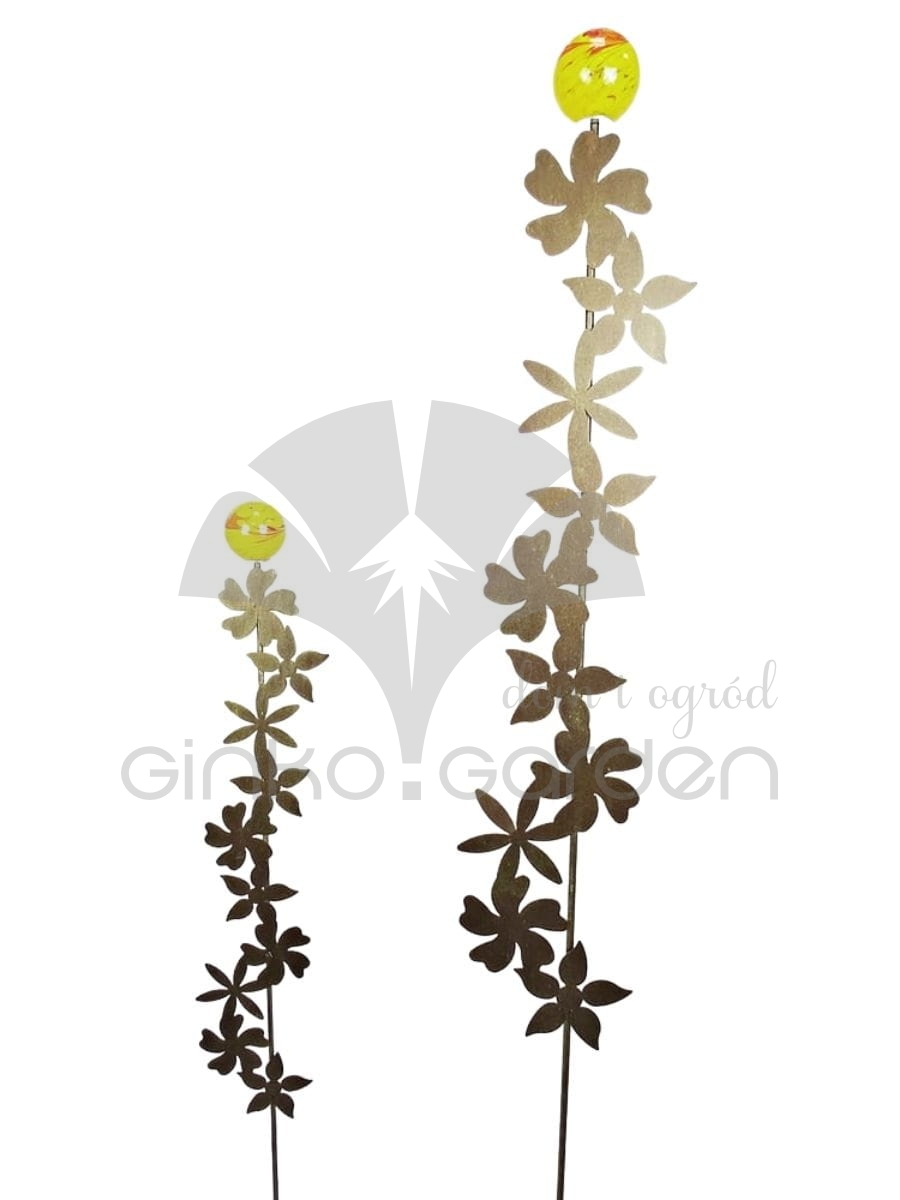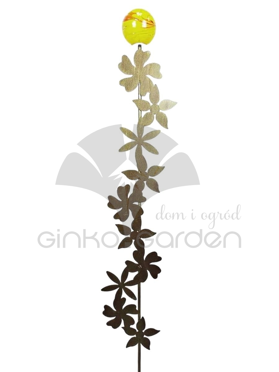 Podpora ogrodowa z metalu - kwiaty na pręcie. Dekoracja metalowa z żółto-pomarańczową kulą szklaną na szczycie. Wykonana z wysokiej jakości stali, malowana proszkowo na kolor złotej rdzy - odporna na warunki atmosferyczne.