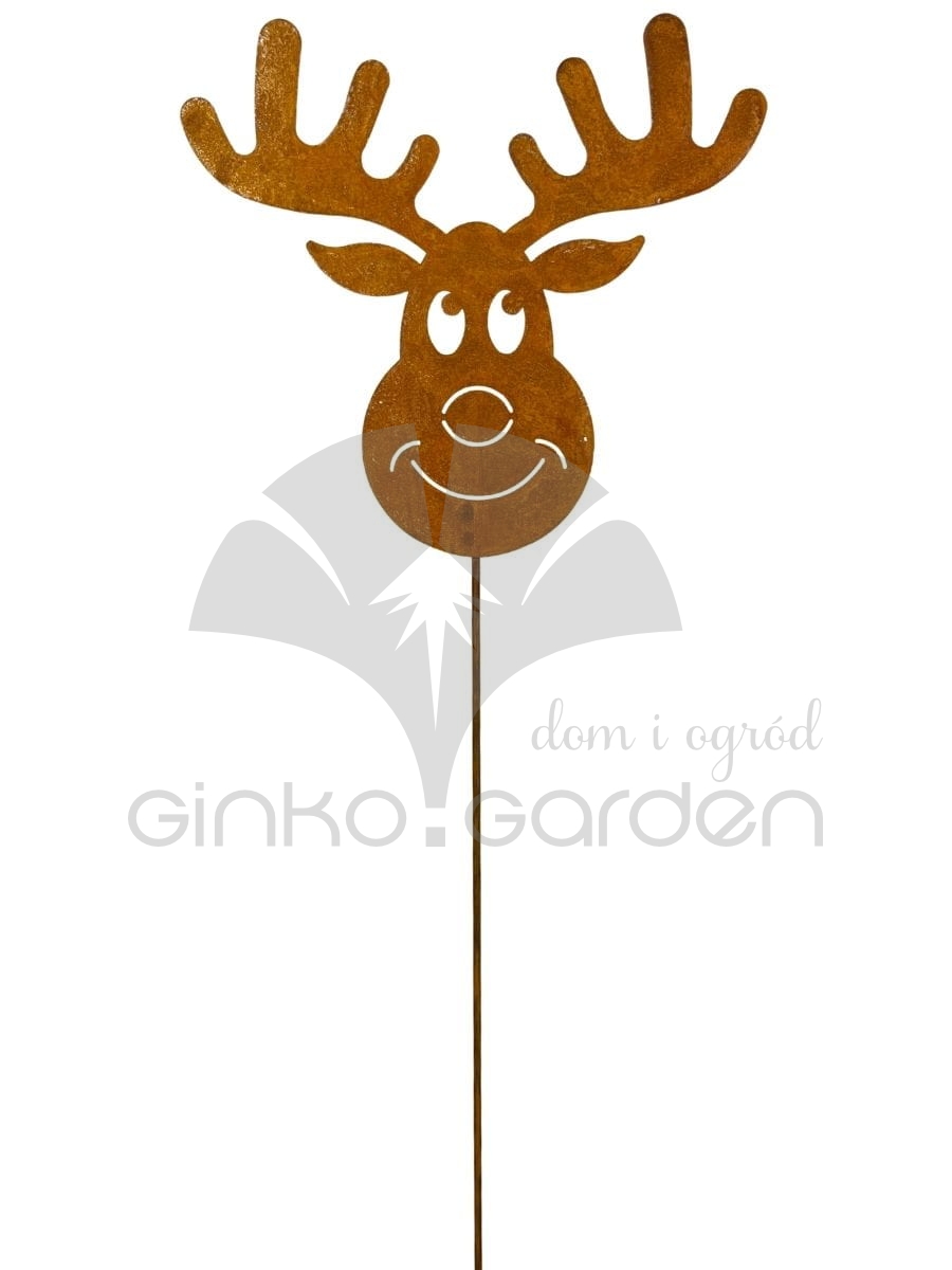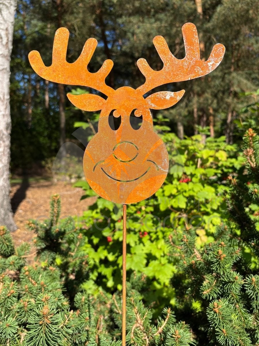 Dekoracja na Boże Narodzenie z metalu - renifer Rudolf na pręcie. Ozdoba świąteczna wykonana w Polsce z wysokiej jakości stali, pokrytej naturalną warstwą rdzy. Odporna na warunki atmosferyczne.