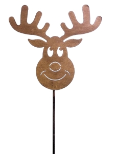 Dekoracja na Boże Narodzenie z metalu - renifer na pręcie. Ozdoba świąteczna wykonana w Polsce z wysokiej jakości stali, pomalowanej proszkowo na kolor złotej rdzy. Odporna na warunki atmosferyczne.