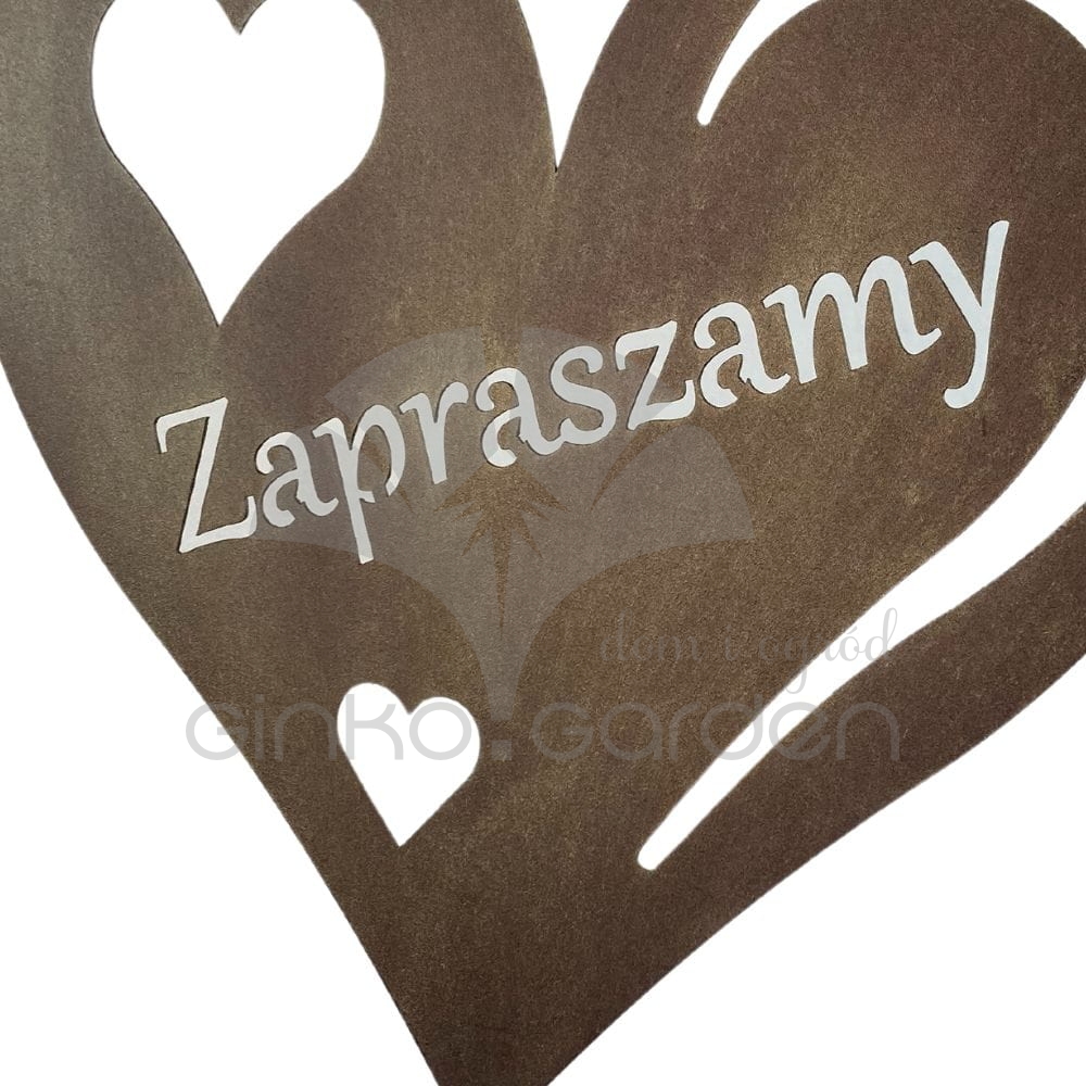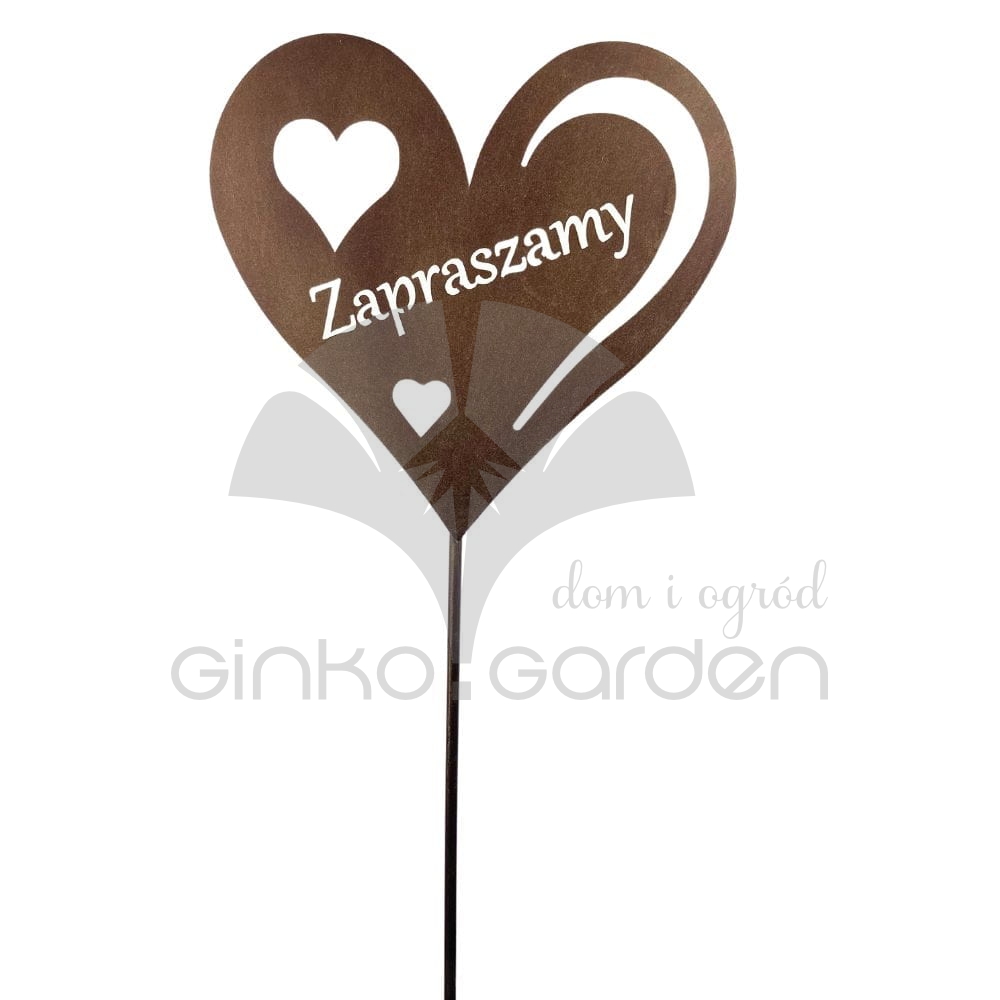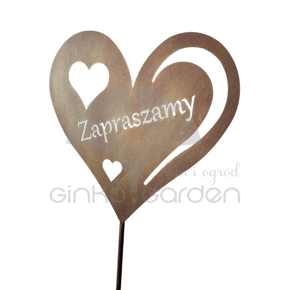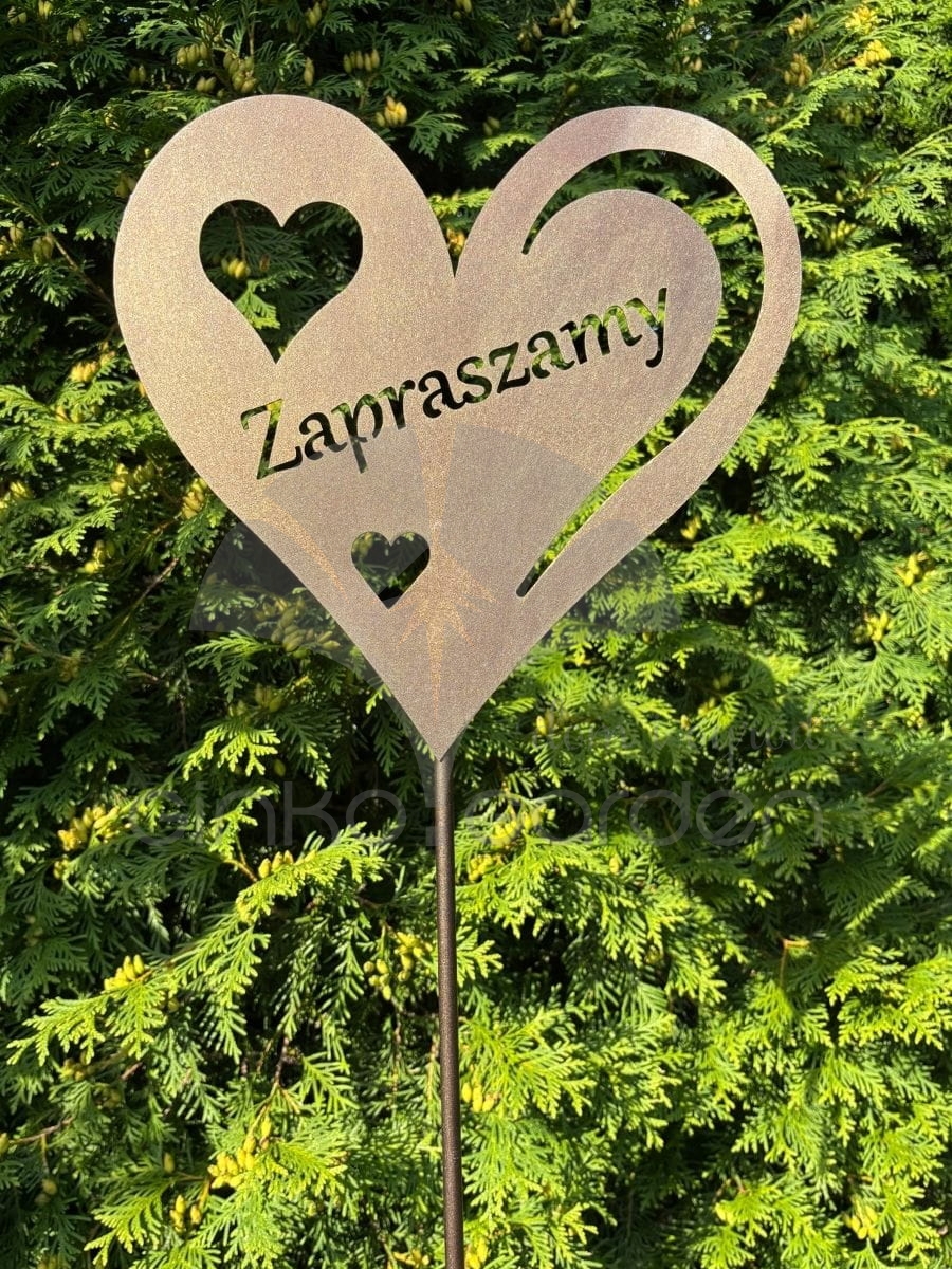 Metalowe Serce z napisem - Zapraszamy - wyjątkowa biżuteria ogrodowa na pręcie w kolorze złotej rdzy