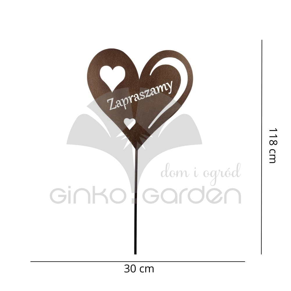 Metalowa dekoracja na pręcie - Serce z napisem "Zapraszamy", które z pewnością będzie oryginalną ozdobą Twojego ogrodu! Pomalowana proszkowo na kolor złotej rdzy.