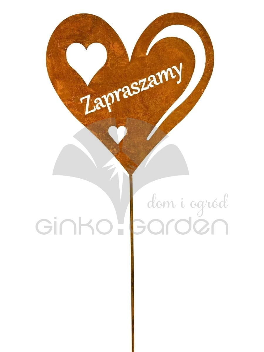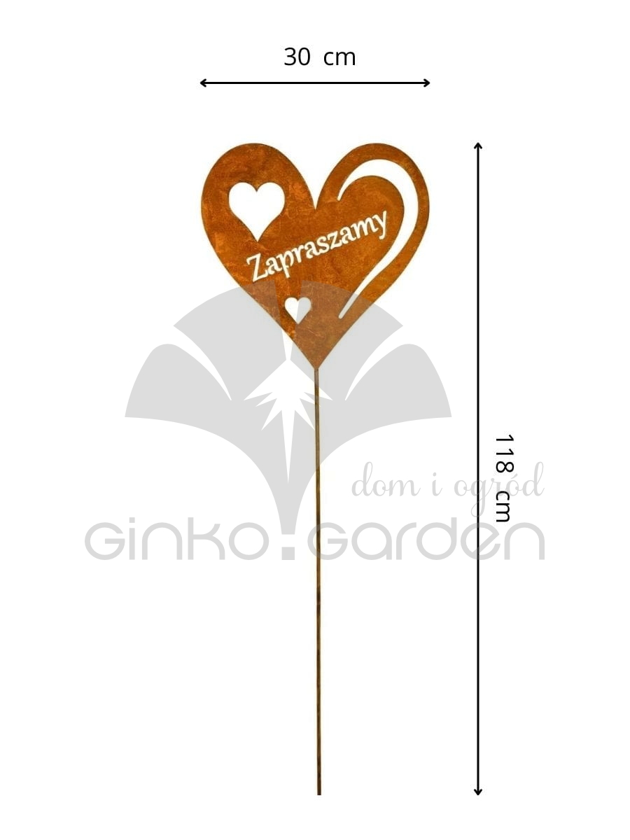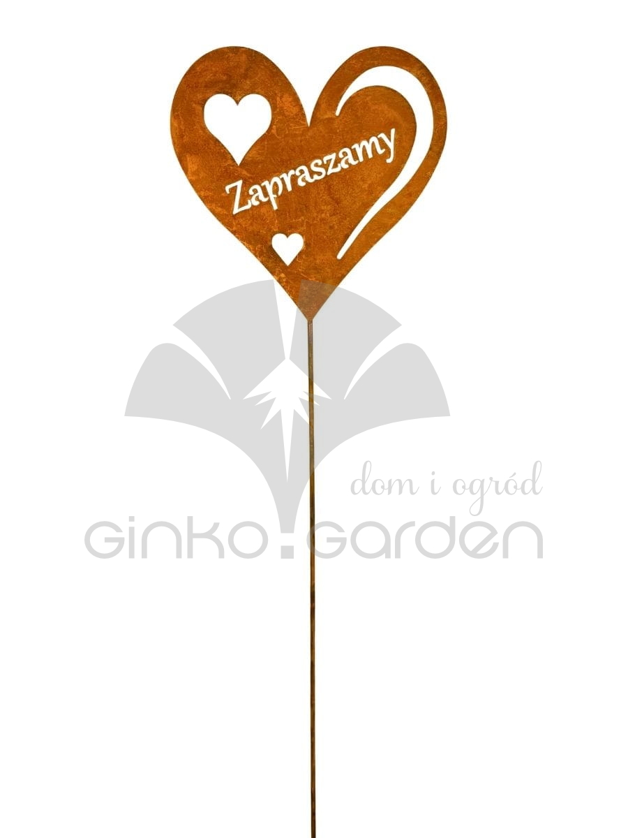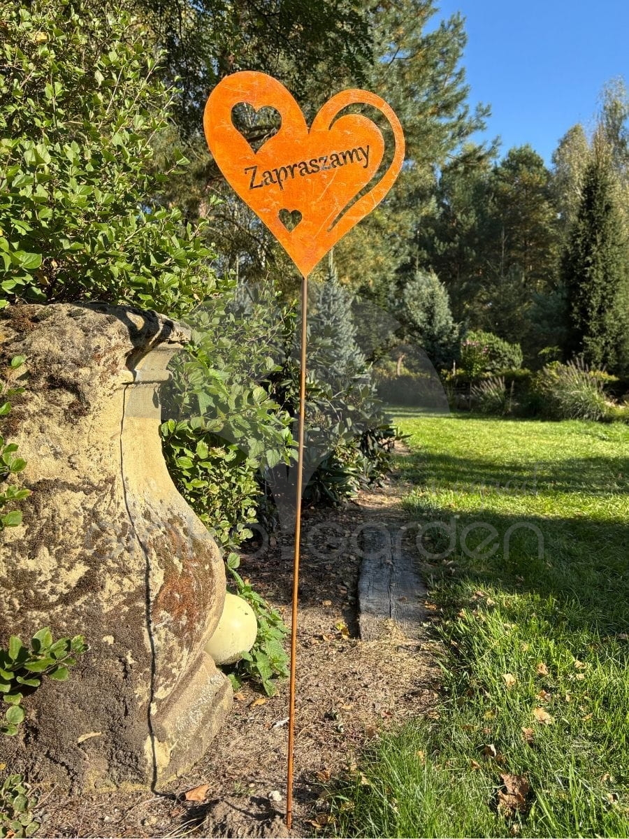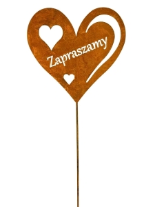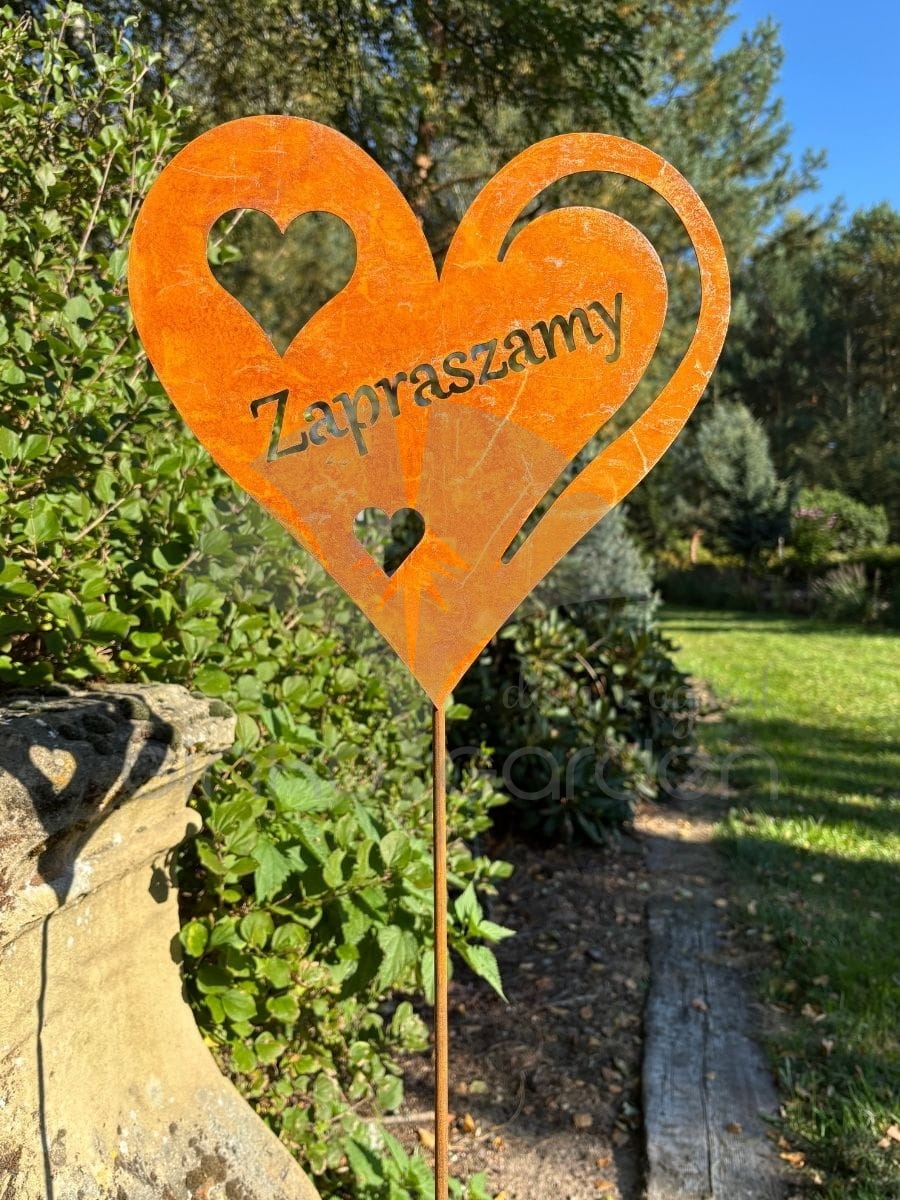 Metalowa dekoracja na pręcie - Serce z napisem "Zapraszamy", które z pewnością będzie oryginalną ozdobą Twojego ogrodu! Wykonana w Polsce, pokryta naturalną warstwą rdzy, odporna na warunki atmosferyczne.