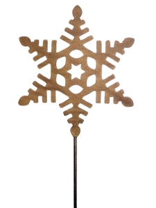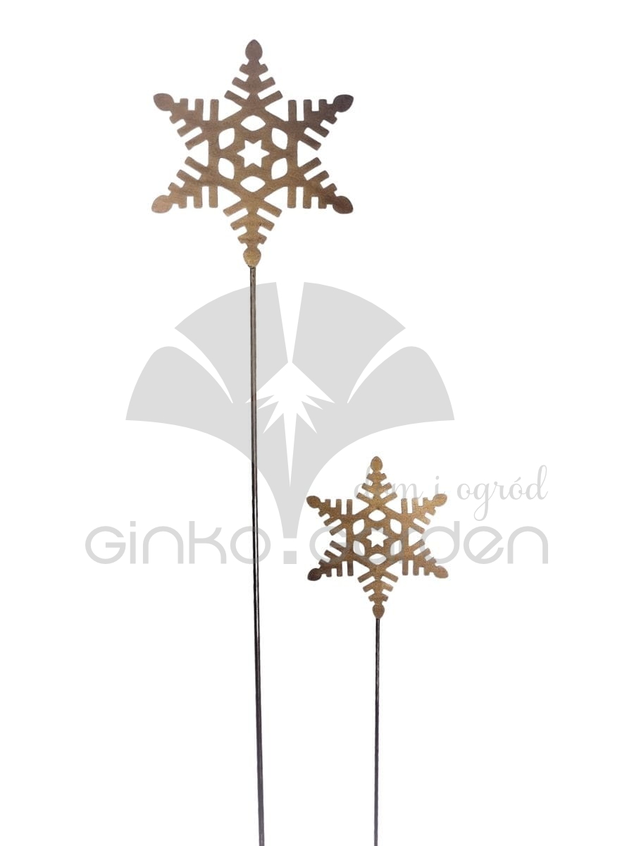 Metalowa dekoracja na Boże Narodzenie - śnieżynka na pręcie do ogrodu. Ozdoba świąteczna wykonana w Polsce z wysokiej jakości stali, pomalowanej proszkowo na kolor złotej rdzy. Odporna na warunki atmosferyczne.