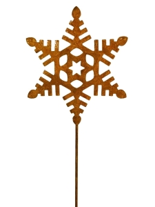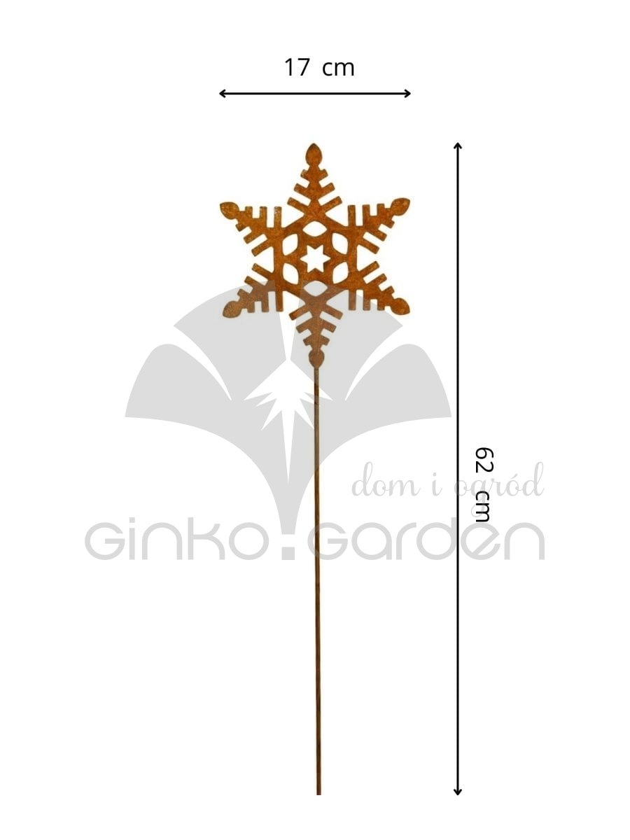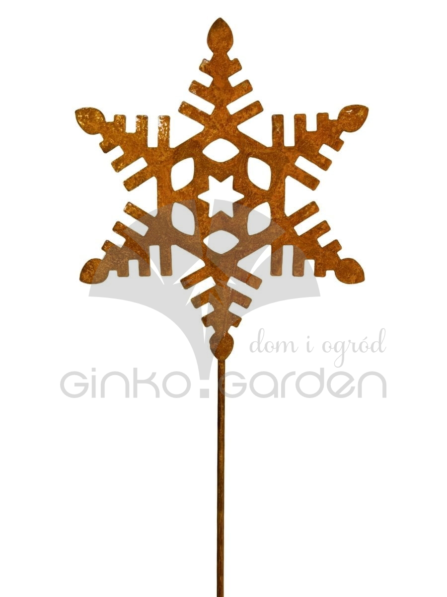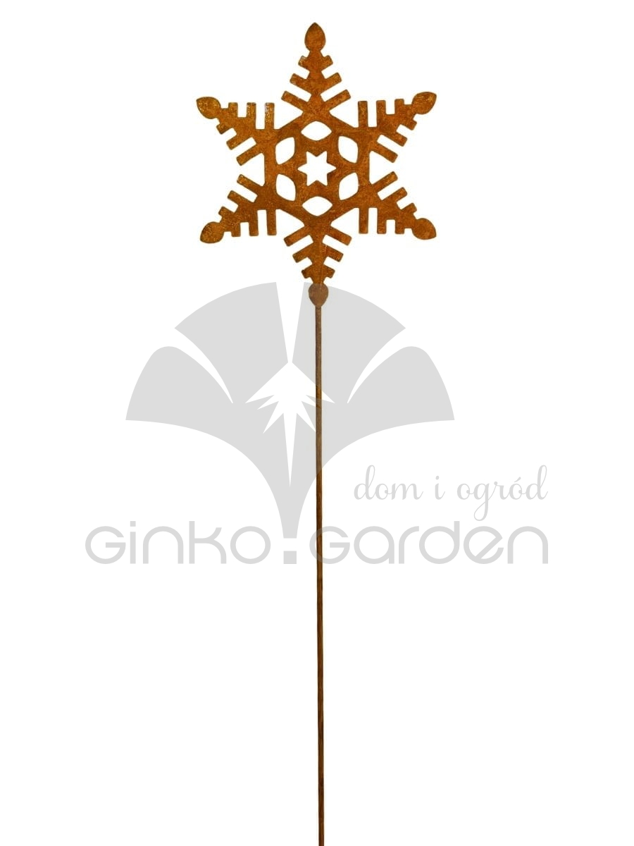 Dekoracja na Boże Narodzenie z metalu - płatek śniegu na pręcie. Ozdoba świąteczna wykonana w Polsce z wysokiej jakości stali, pokrytej naturalną warstwą rdzy. Odporna na warunki atmosferyczne.