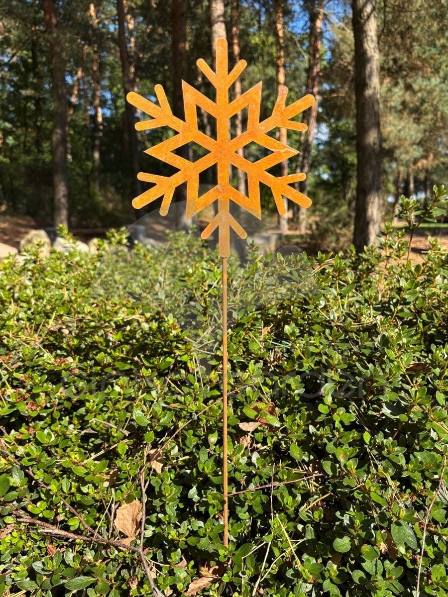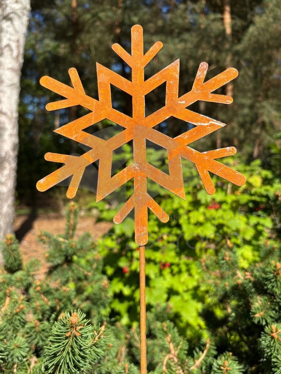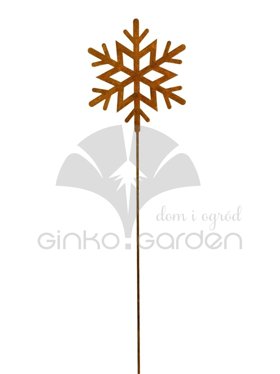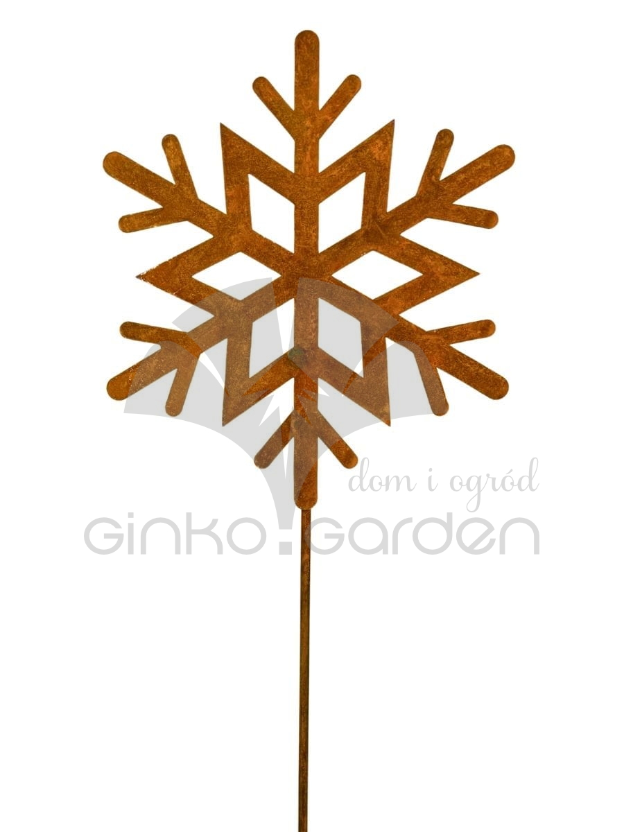 Dekoracja na Boże Narodzenie z metalu - płatek śniegu na pręcie. Ozdoba świąteczna wykonana w Polsce z wysokiej jakości stali, pokrytej naturalną warstwą rdzy. Odporna na warunki atmosferyczne.